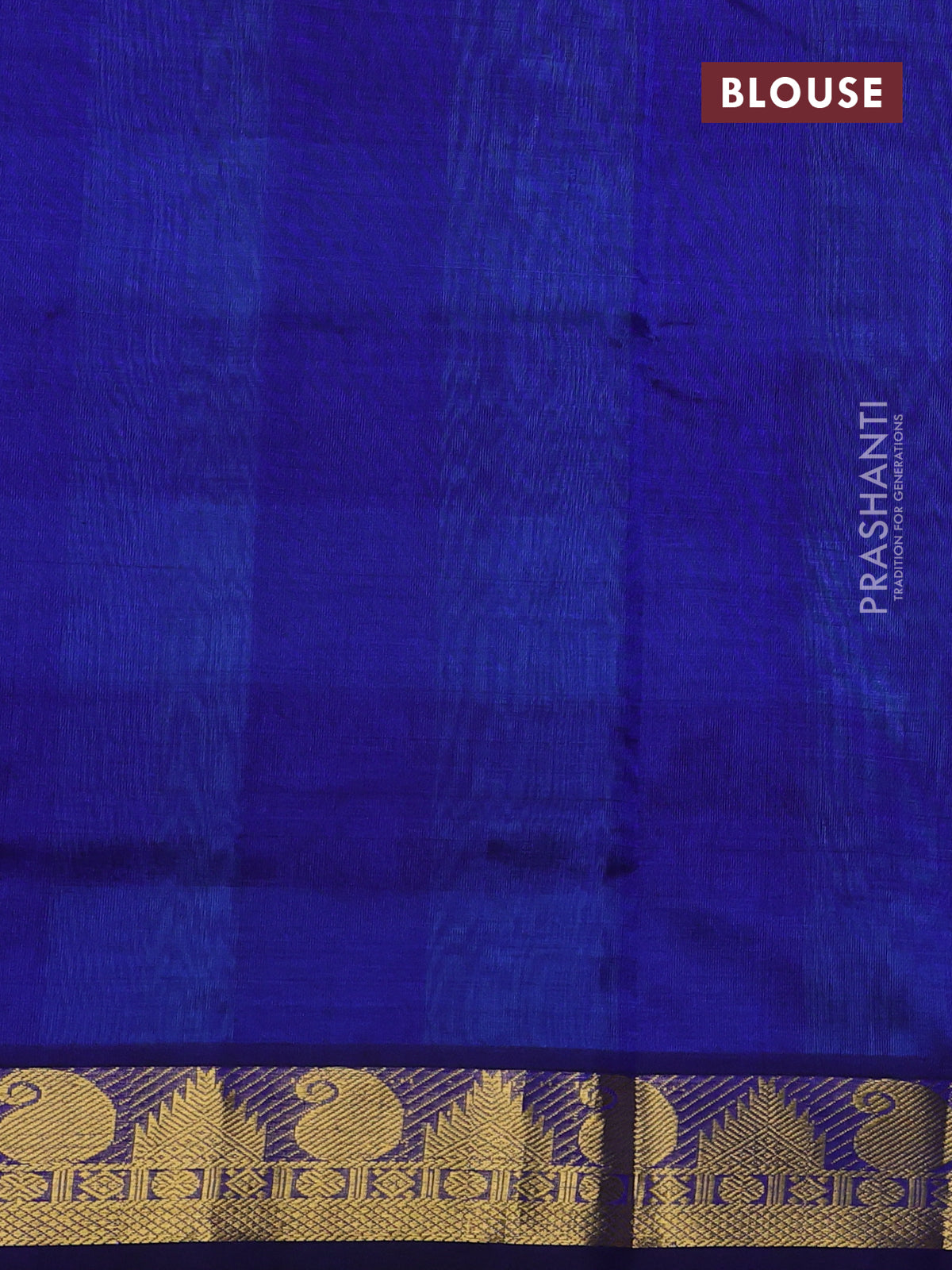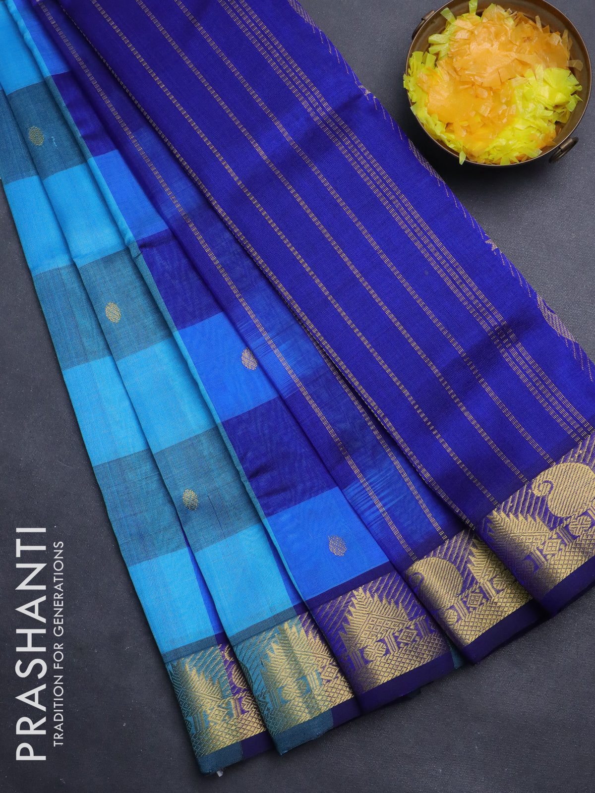 Silk cotton saree light blue and dark blue with allover paalum pazhamum checks & zari buttas and paisley & temple zari woven border