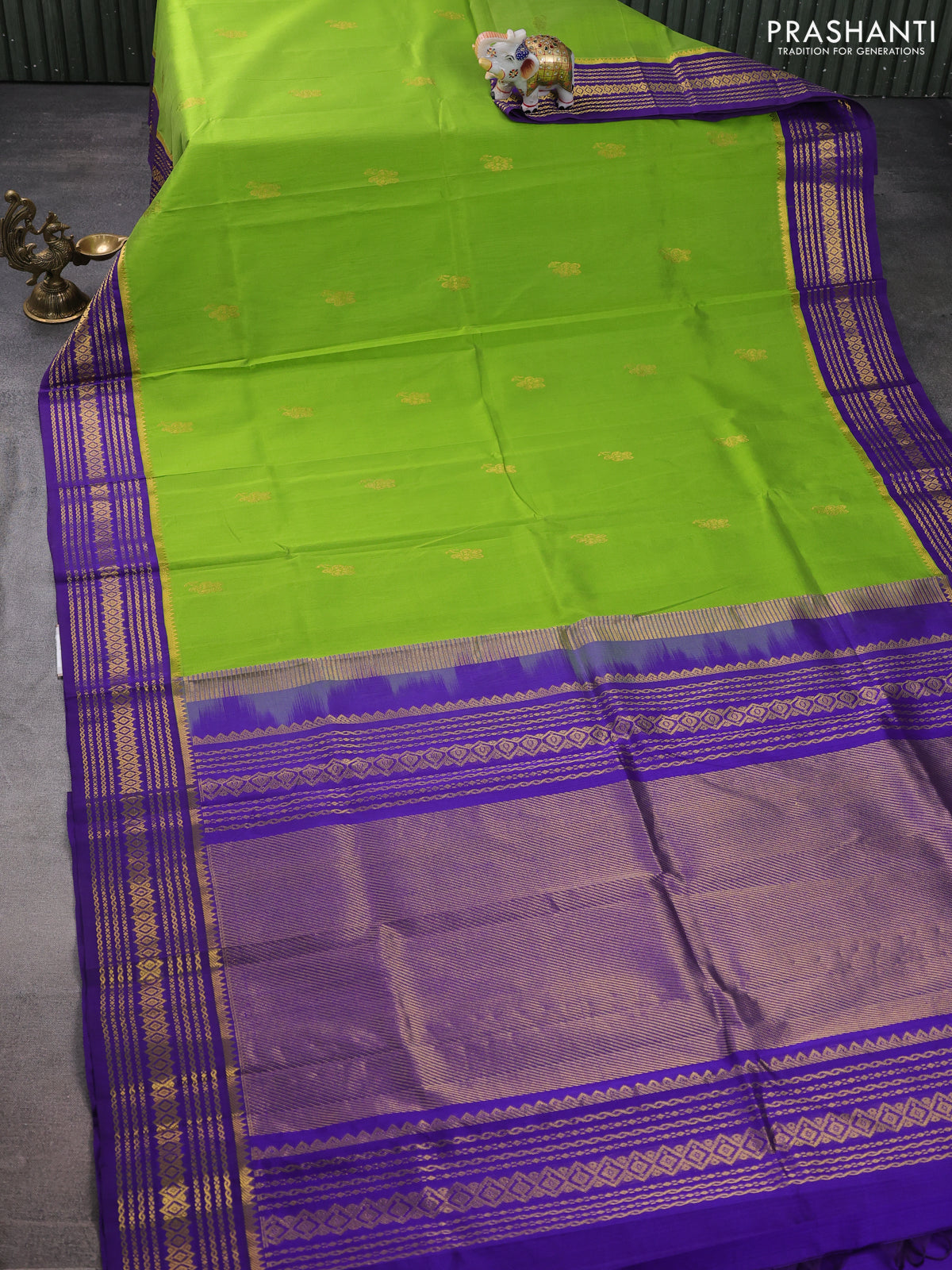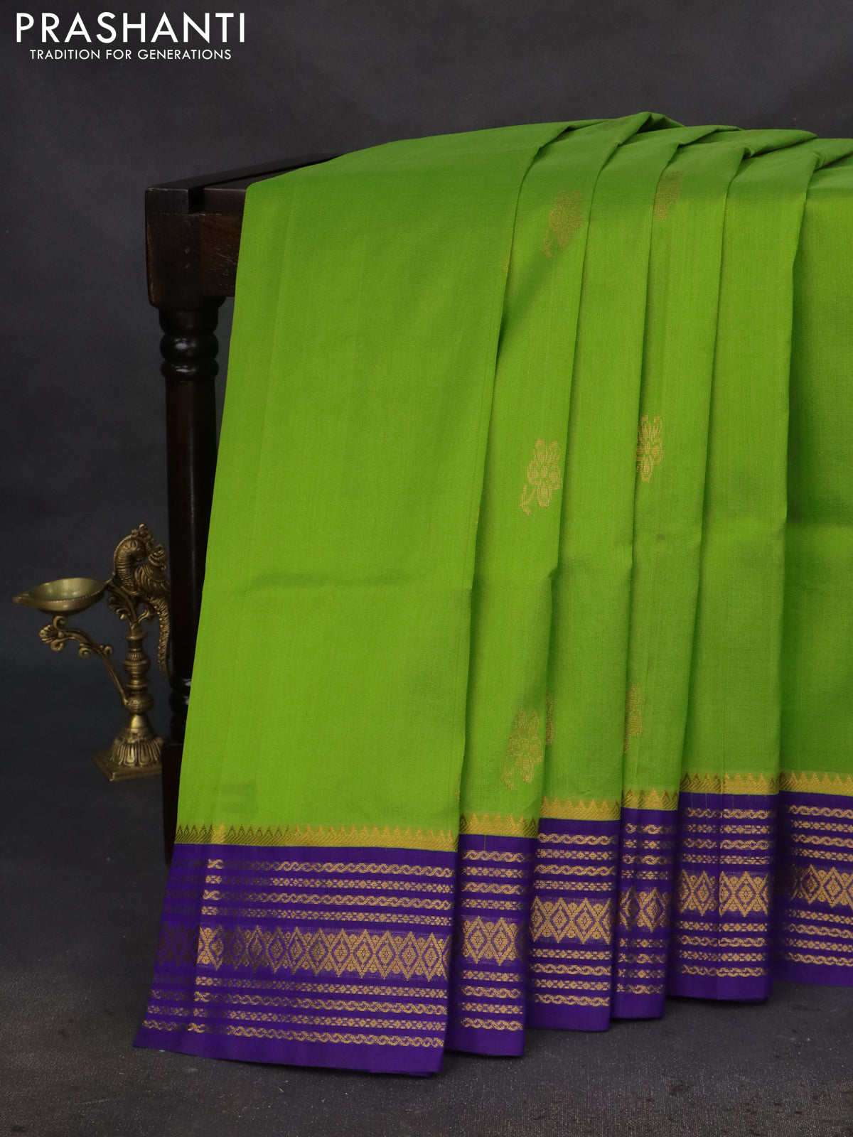 Silk cotton saree light green and blue with zari woven floral buttas and zari woven border
