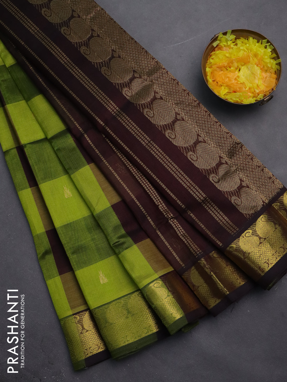 Silk cotton saree light green and coffee brown with allover paalum pazhamum checks & buttas and zari woven border