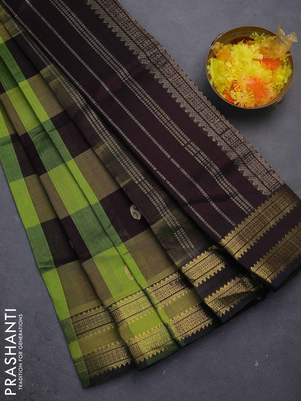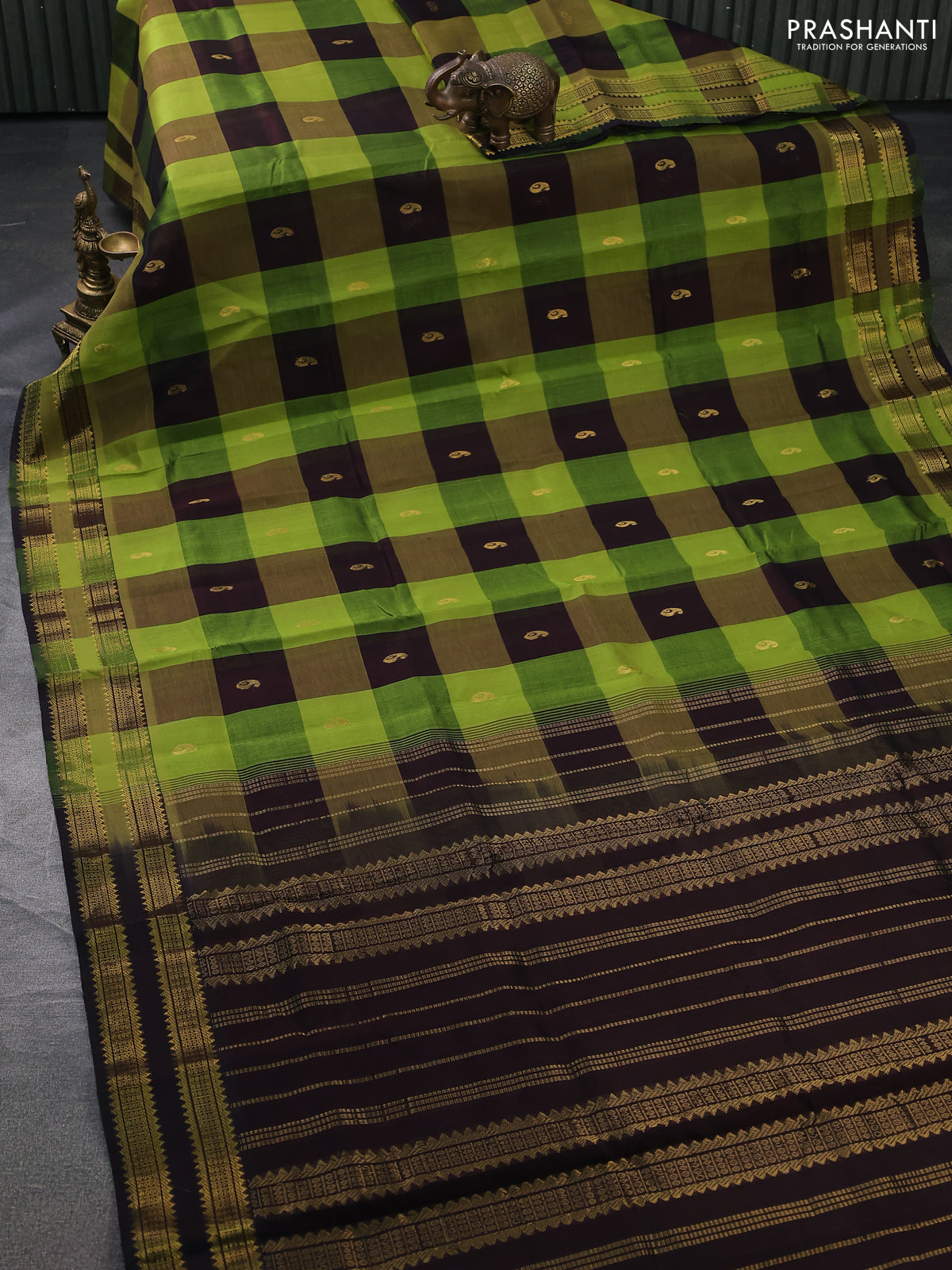 Silk cotton saree light green and coffee brown with allover paalum pazhamun checks & zari buttas and rettapet zari woven border