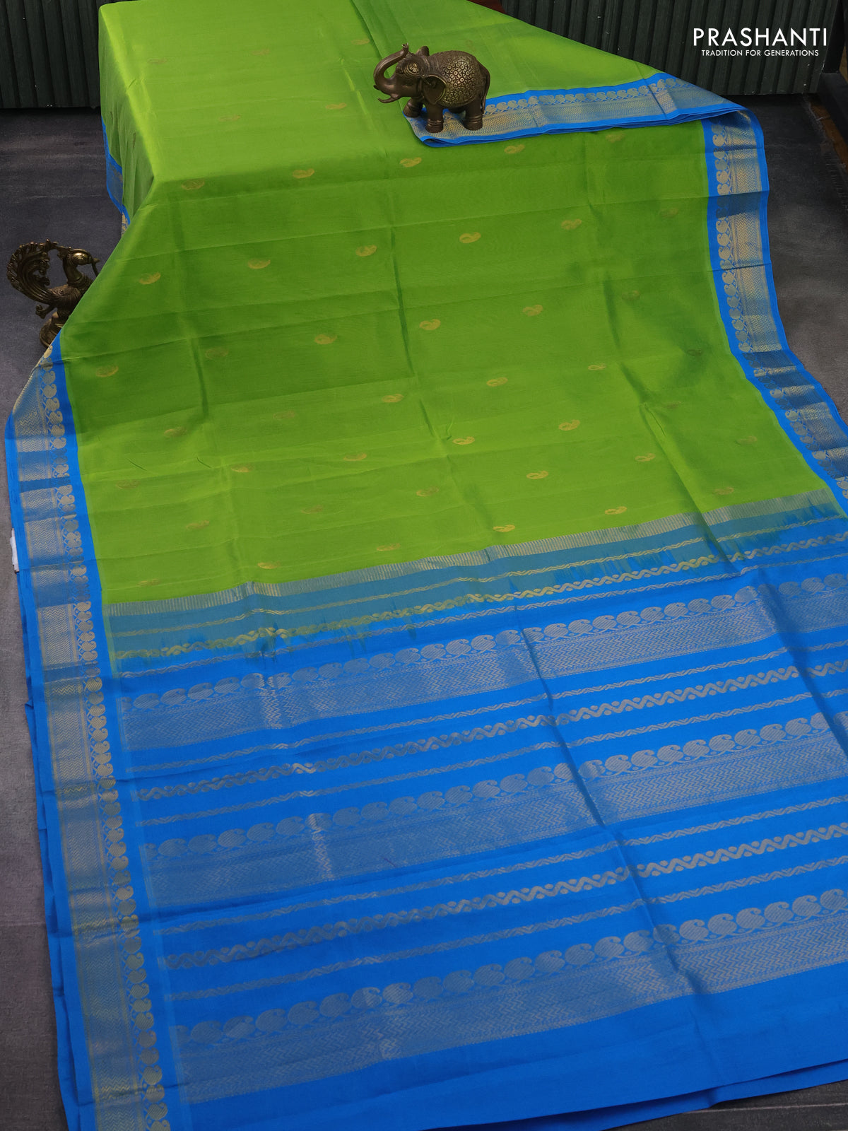 Silk cotton saree light green and cs blue with pailsey zari woven buttas and zari woven korvai border