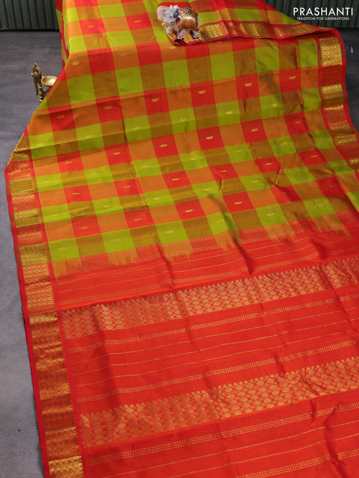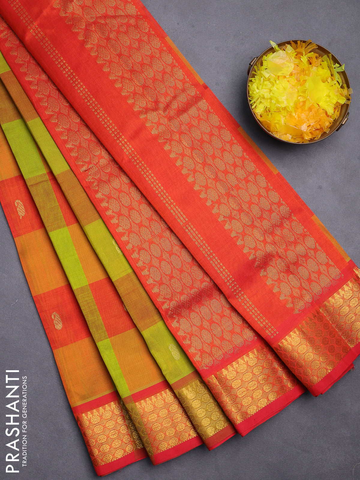 Silk cotton saree light green and orange with allover paalum pazhamum checks & zari buttas and zari woven border