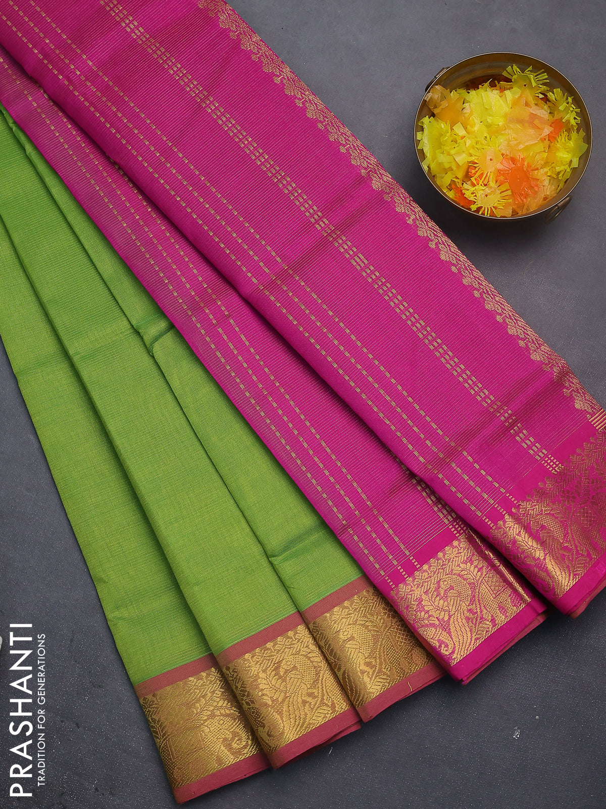 Silk cotton saree light green and pink with allover vairosi weaves & buttas and rich zari woven border