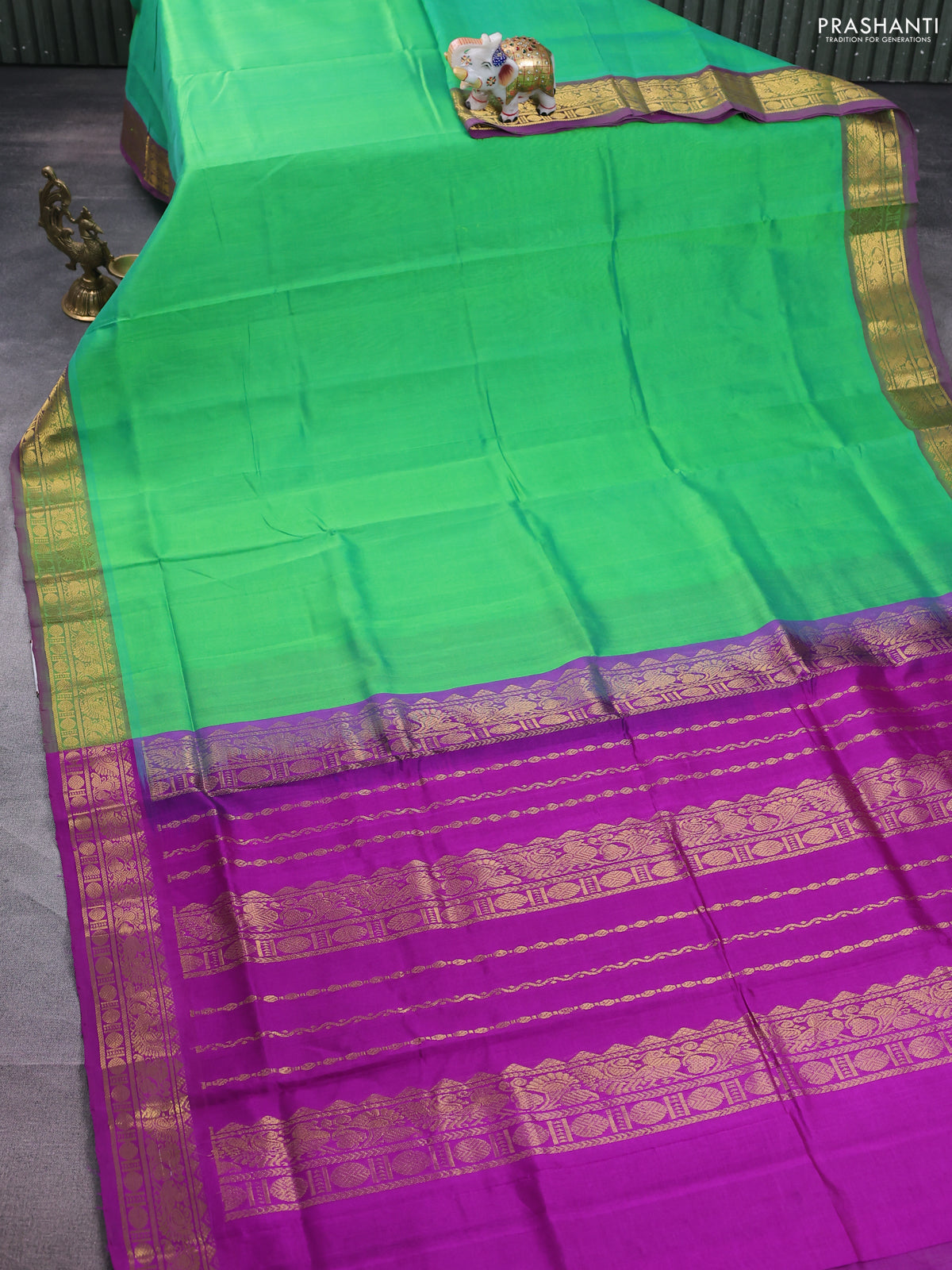 Silk cotton saree light green and purple with plain body and zari woven border