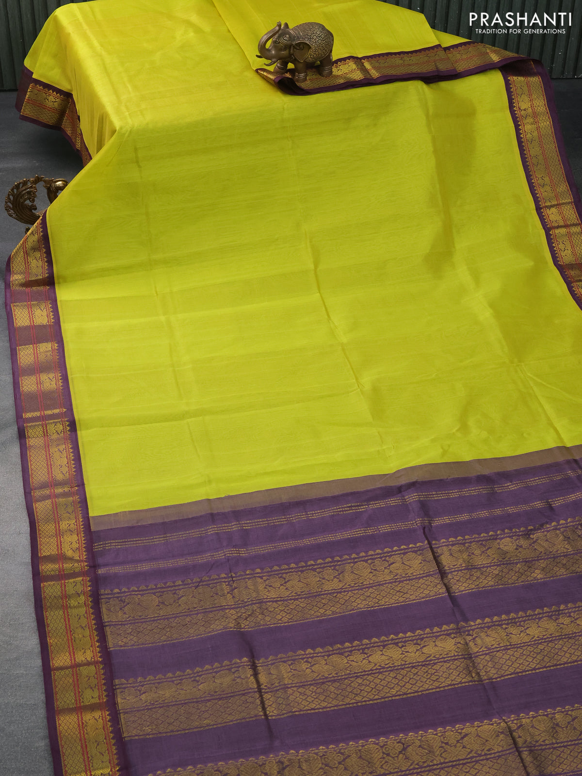 Silk cotton saree lime yellow and deep jamun shade with plain body and zari woven annam border