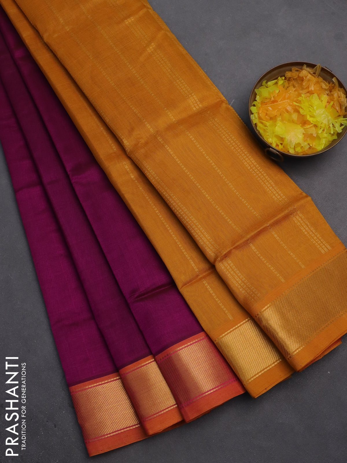 Silk cotton saree magenta pink and mustard yellow with plain body and zari woven border