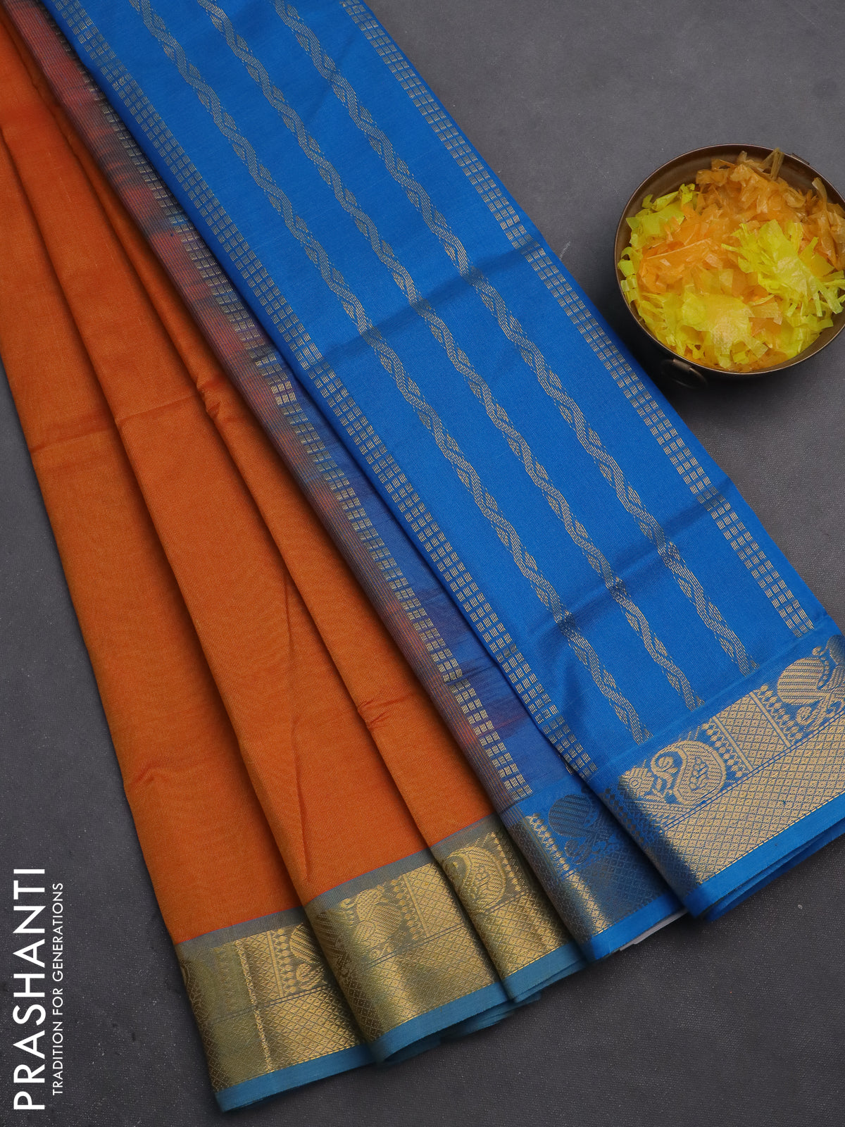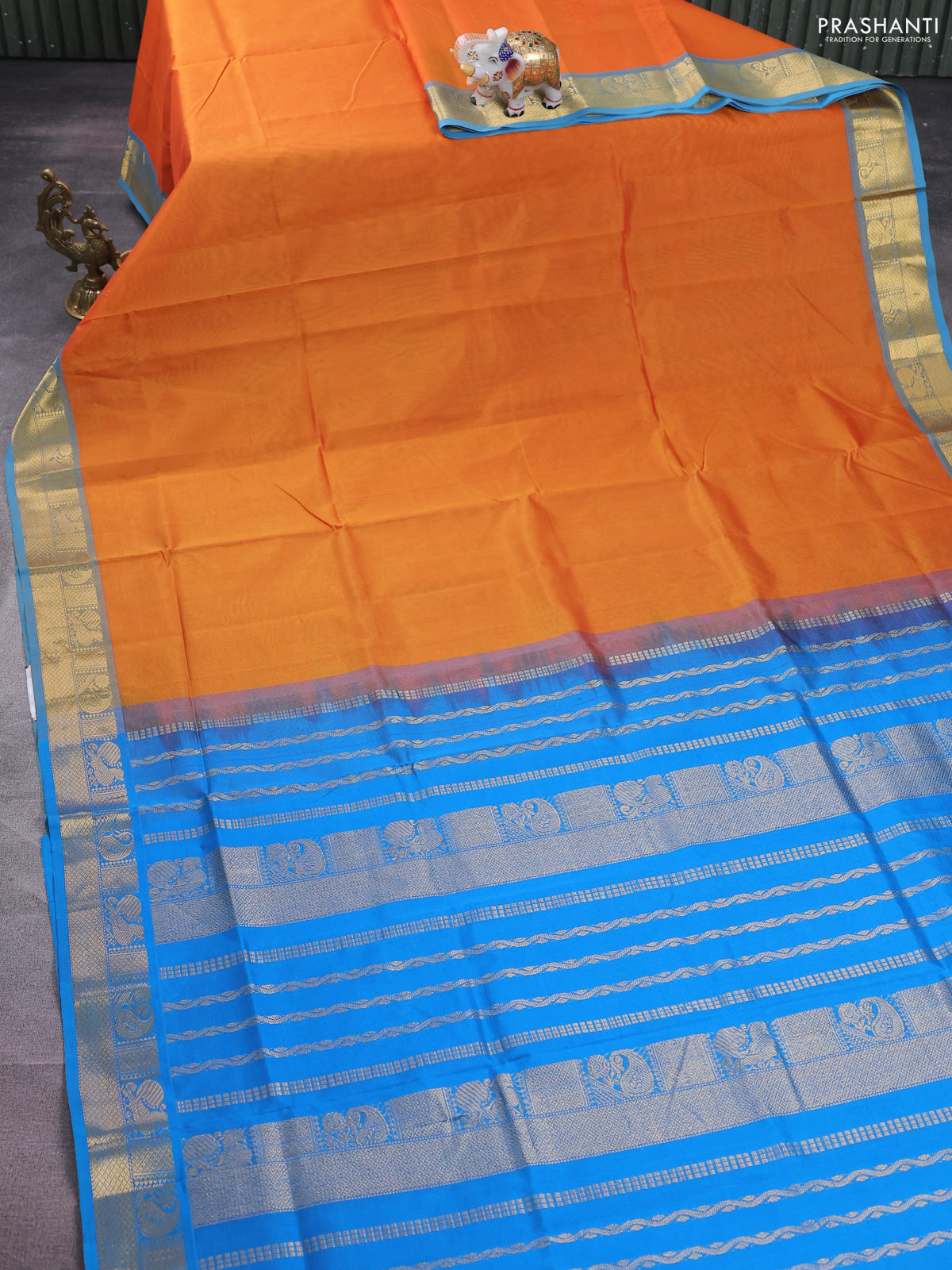 Silk cotton saree mango yellow and cs blue with plain body and zari woven border