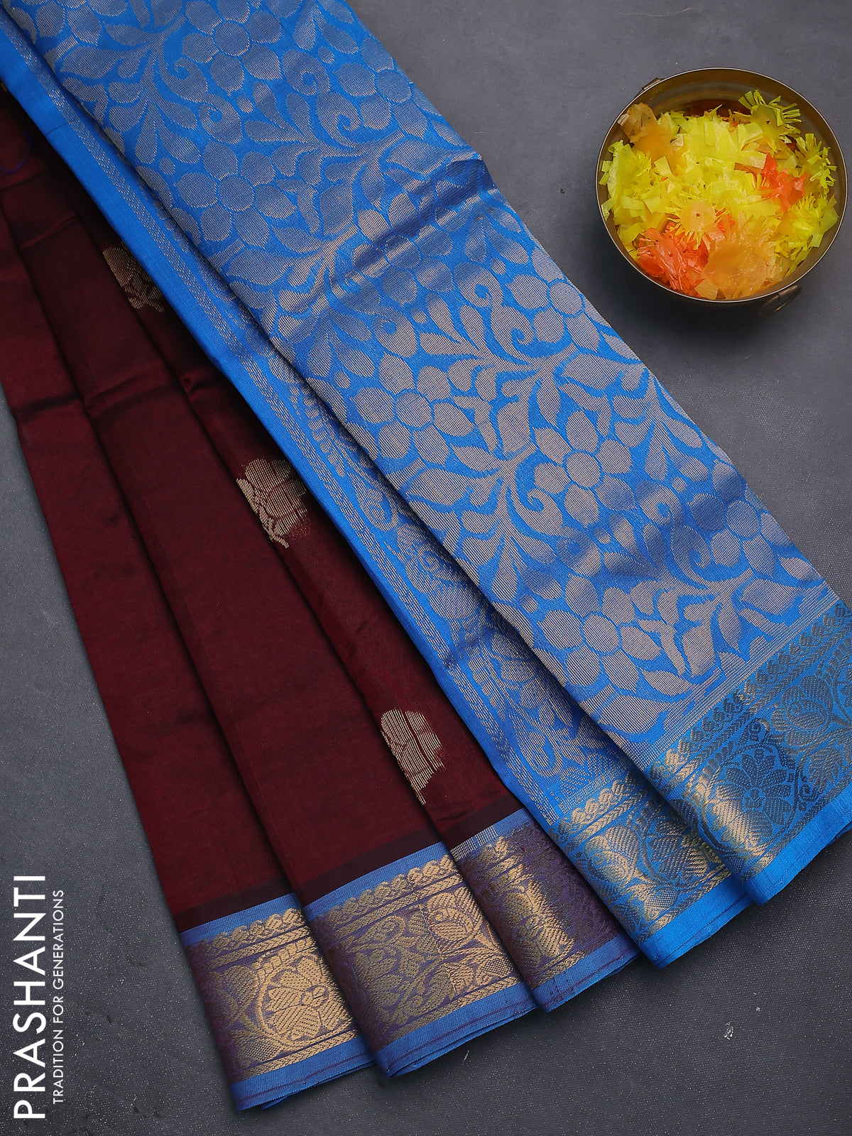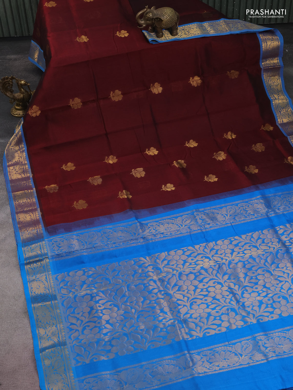 Silk cotton saree maroon and cs blue with zari woven floral buttas and zari woven border