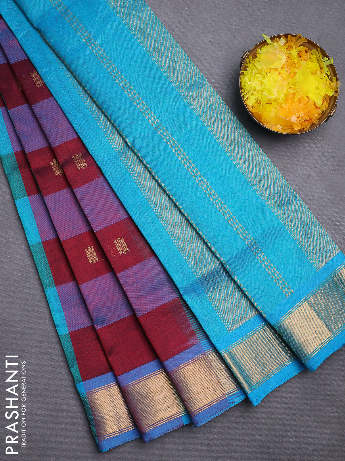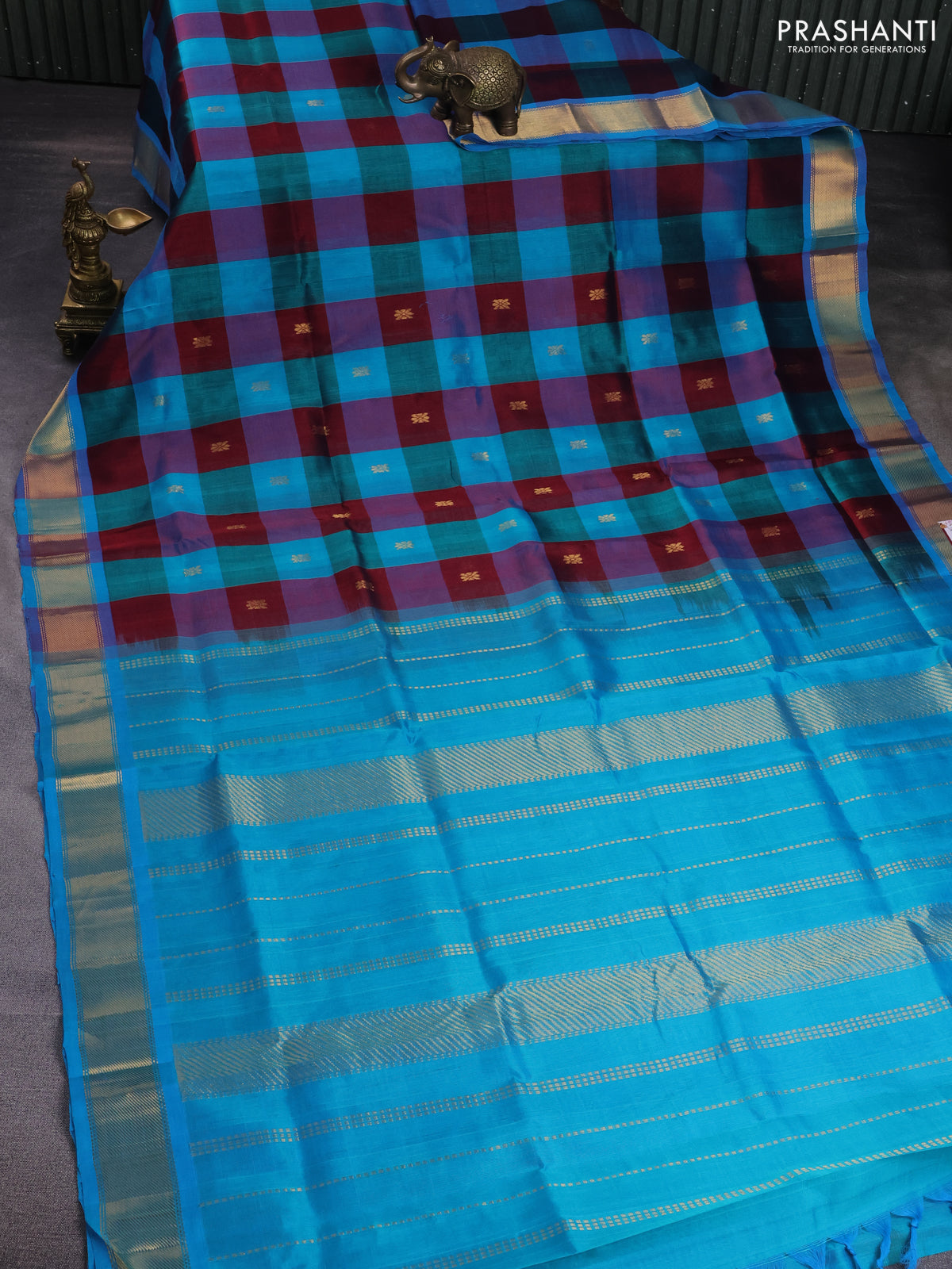 Silk cotton saree maroon and dual shade of teal blue with allover paalum pazhamum checks & zari buttas and zari woven border