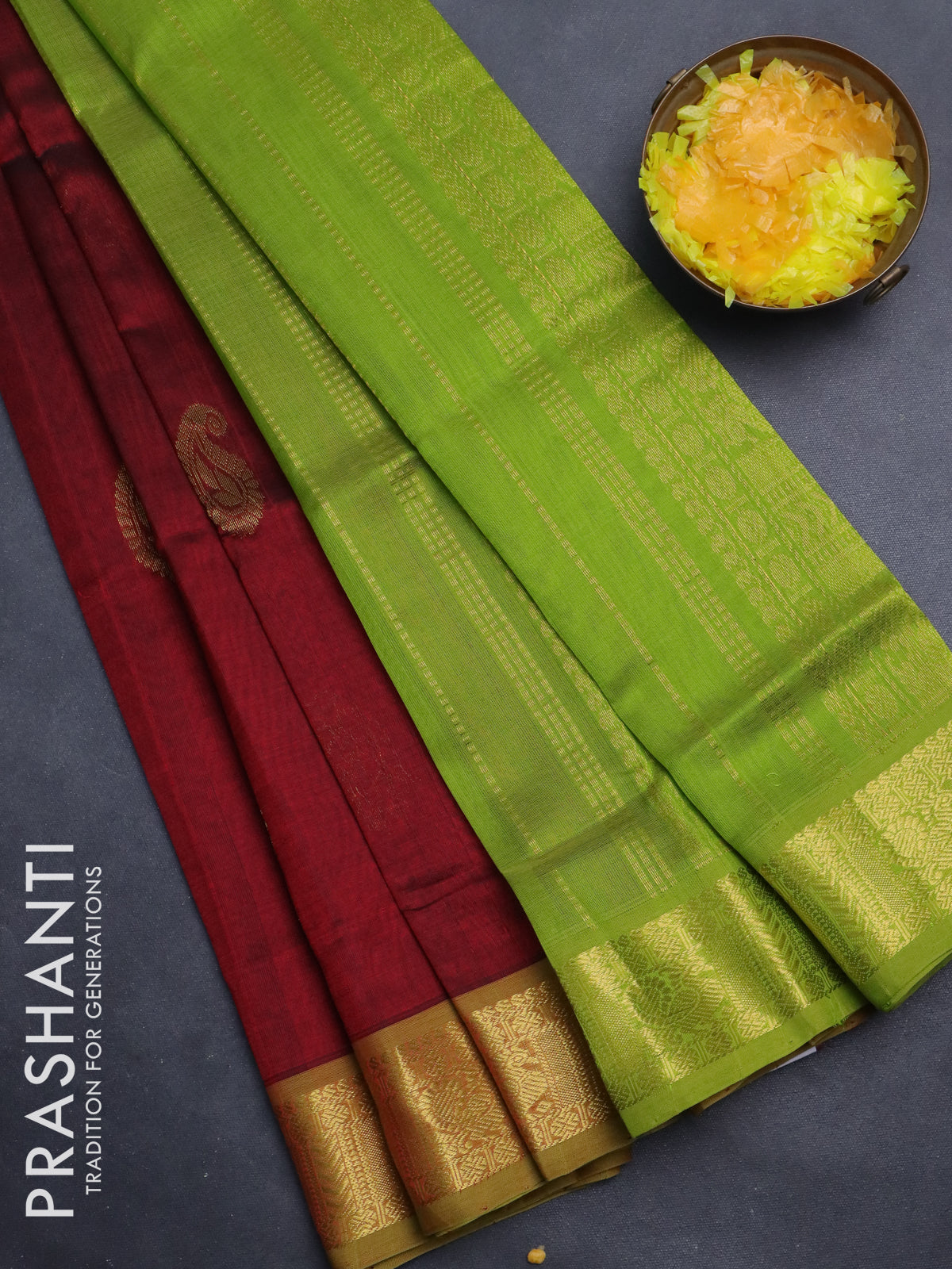 Silk cotton saree maroon and light green with paisley zari woven buttas and zari woven border