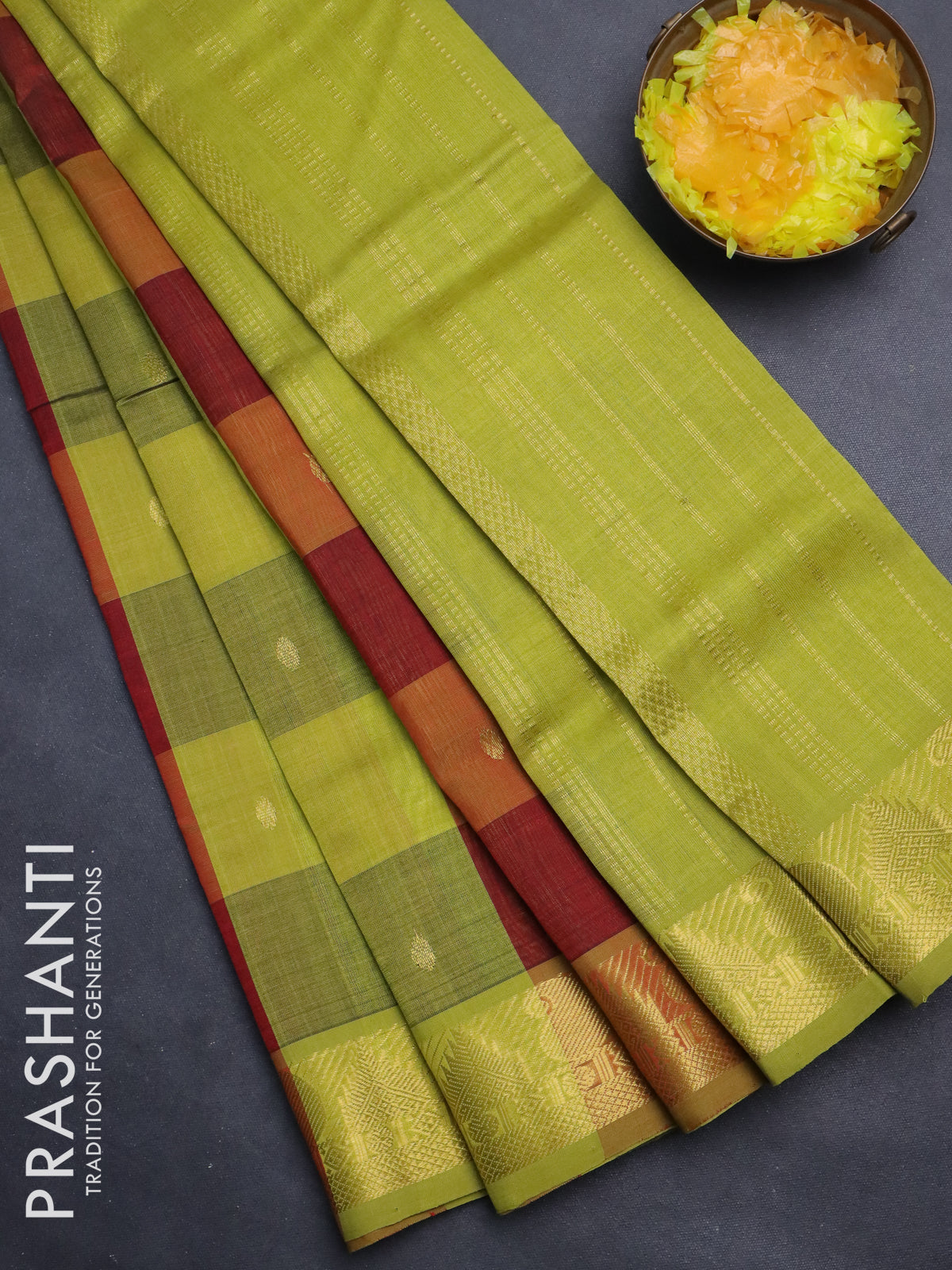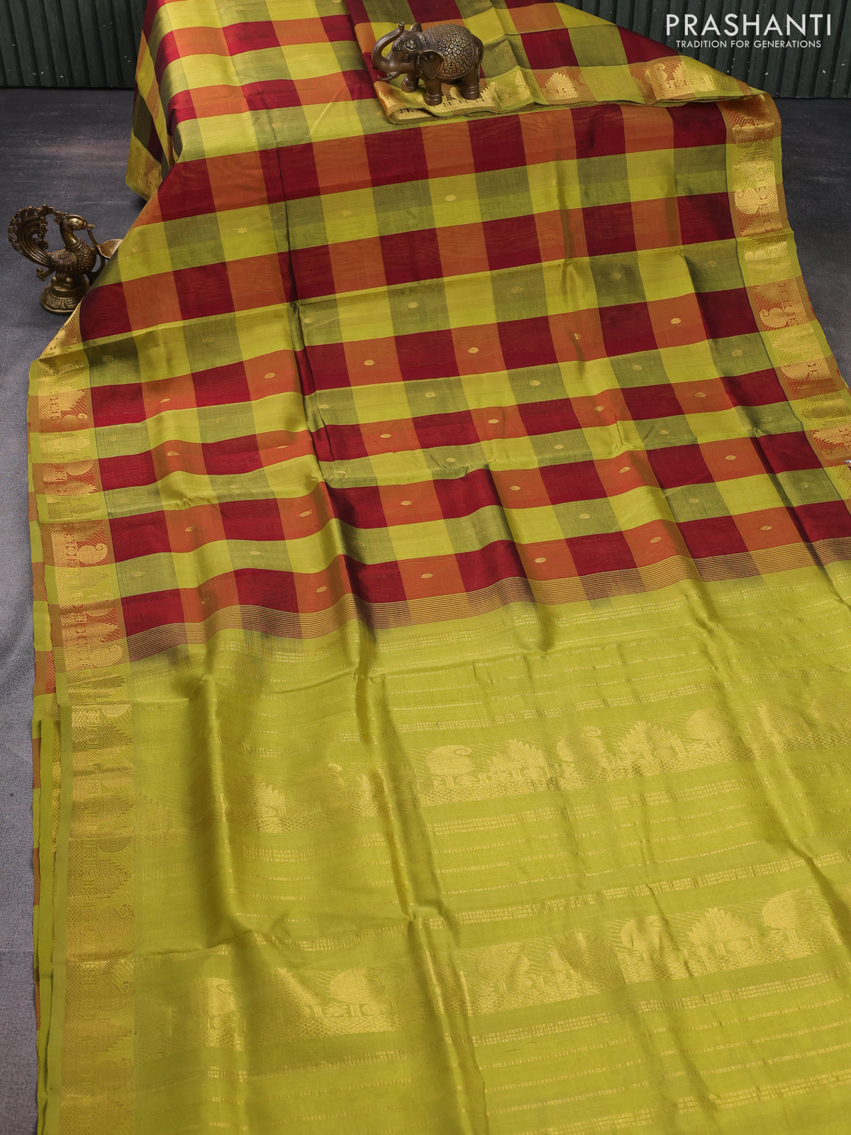 Silk cotton saree maroon and lime yellow with allover paalum pazhamum checks & zari buttas and paisley & temple zari woven border