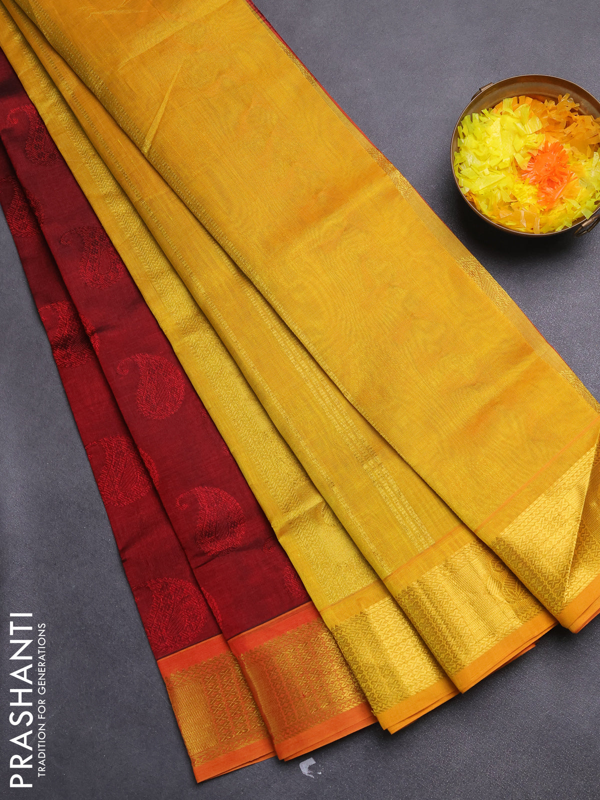 Silk cotton saree maroon and mustard yellow with allover self emboss jacquard and zari woven border