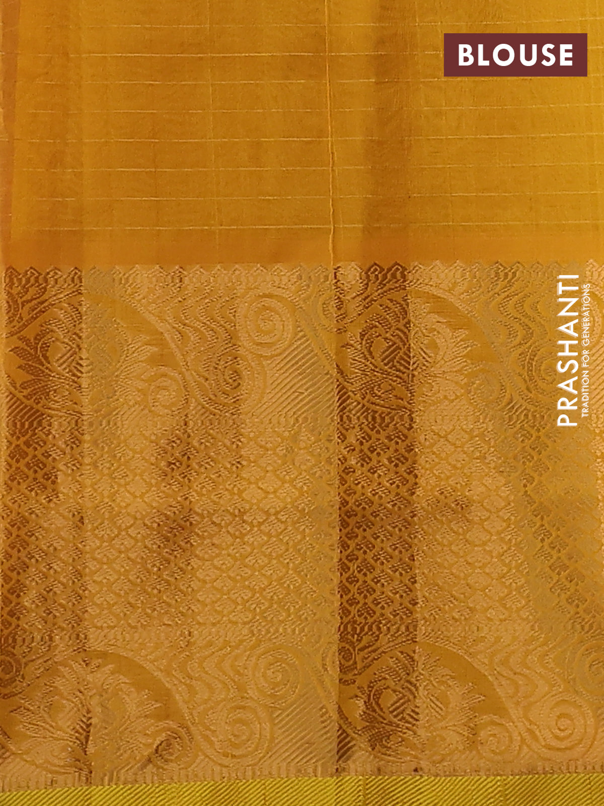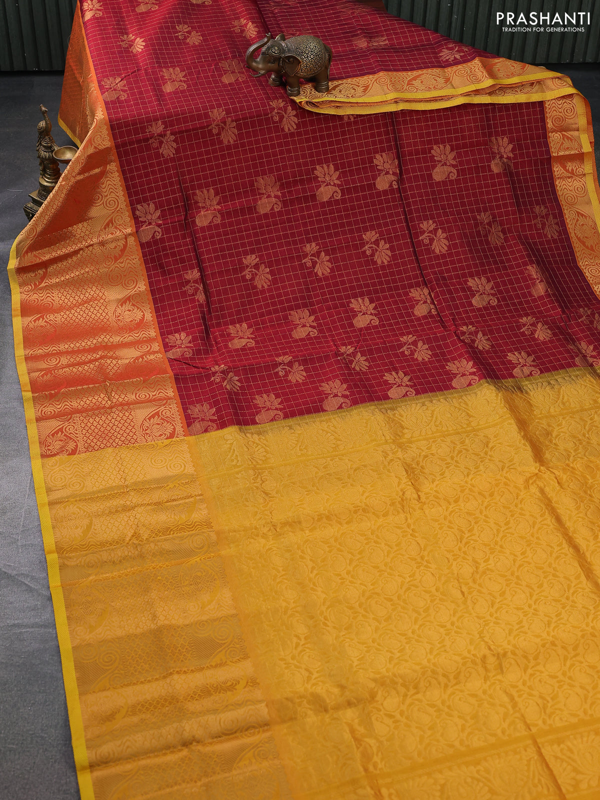 Silk cotton saree maroon and mustard yellow with allover zari checks & buttas and long zari woven border