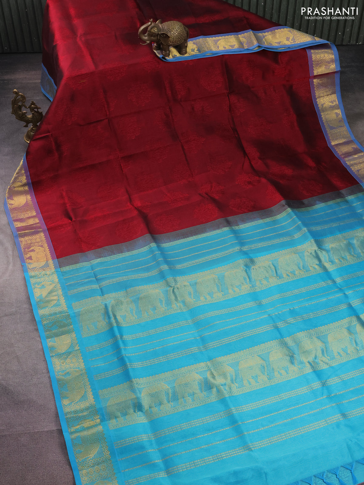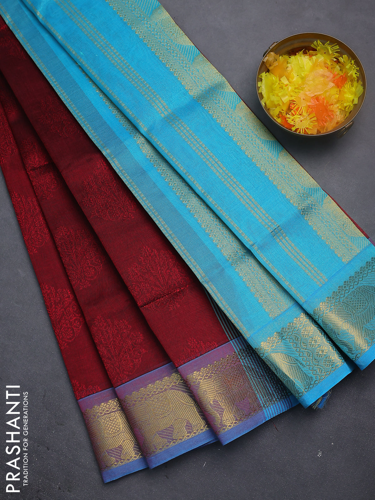 Silk cotton saree maroon and teal blue with allover self emboss jacquard and elephant zari woven border