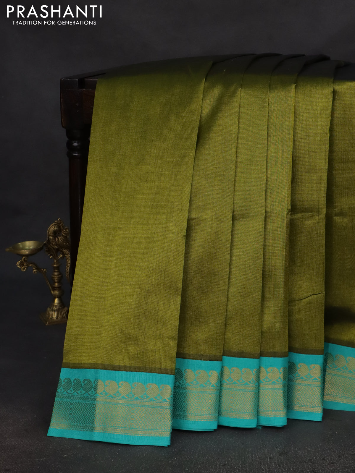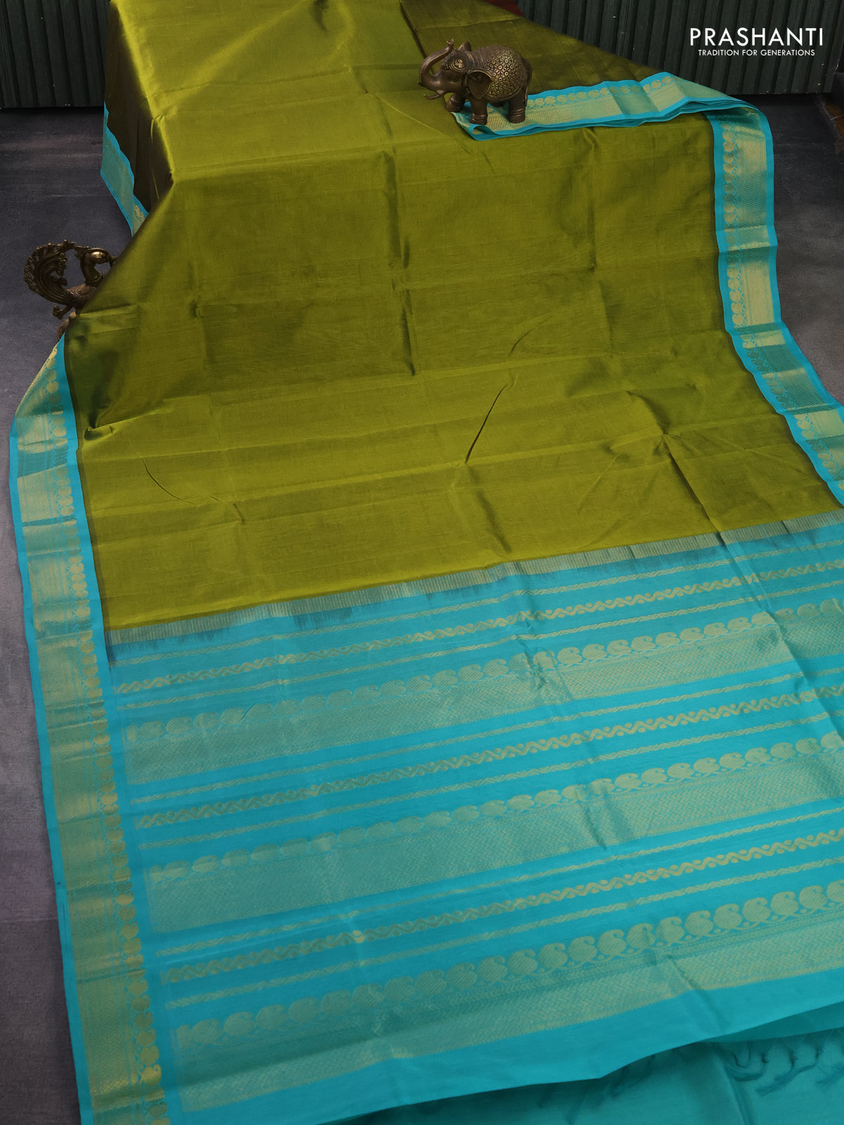 Silk cotton saree mehendi green and teal green with plain body and zari woven korvai border