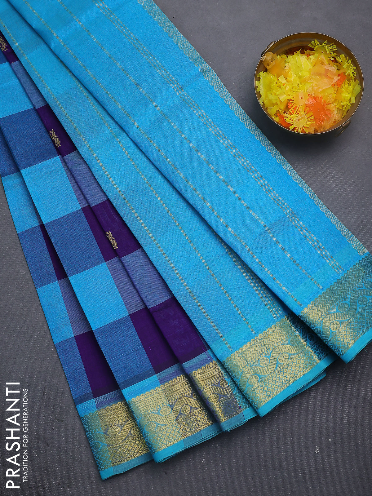 Silk cotton saree multi colour and teal blue with allover paalum pazhamun checks & zari buttas and zari woven border