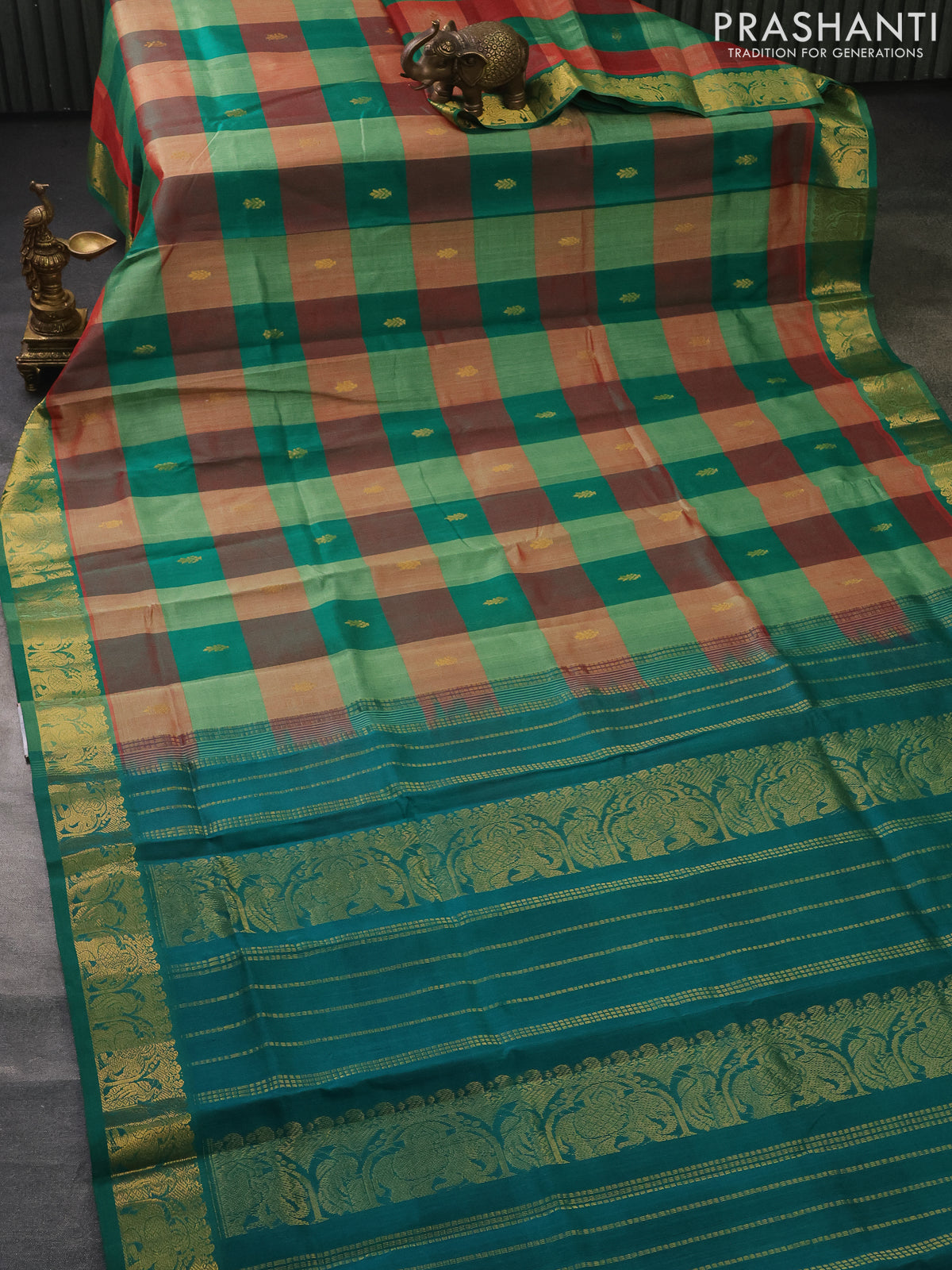 Silk cotton saree multi colour and teal green with allover paalum pazhamun checks & zari buttas and zari woven border