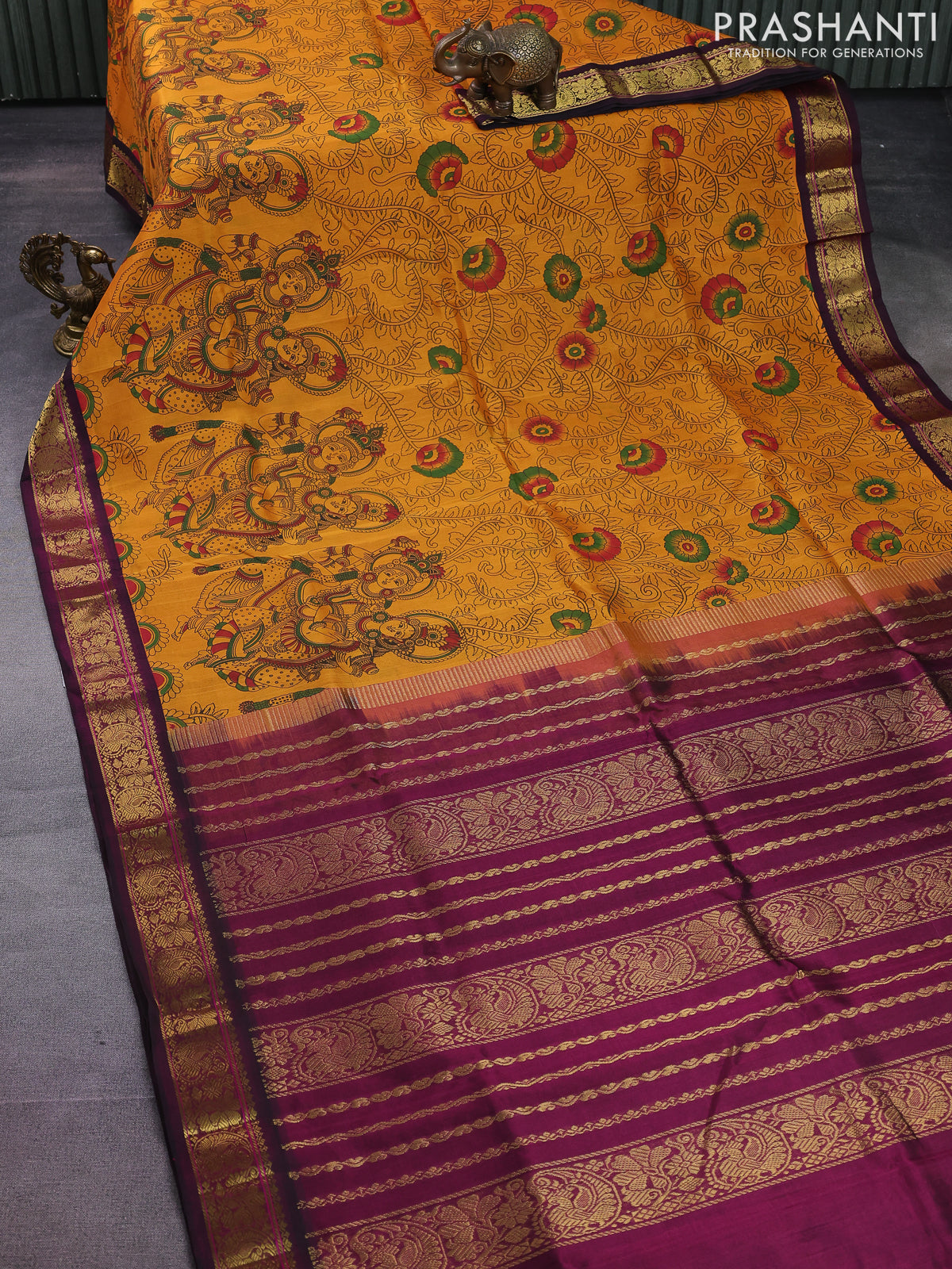 Silk cotton saree mustard yellow and dark magenta pink with allover kalamkari prints and zari woven korvai border