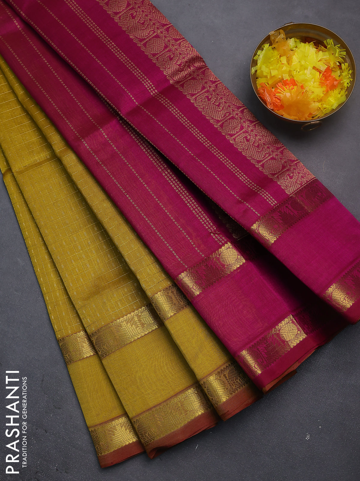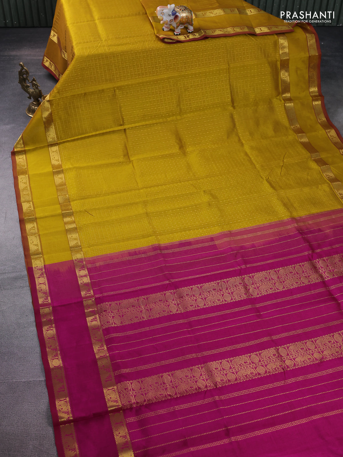 Silk cotton saree mustard yellow and magenta pink with allover lakshadeepam weaves and rettapet zari woven border
