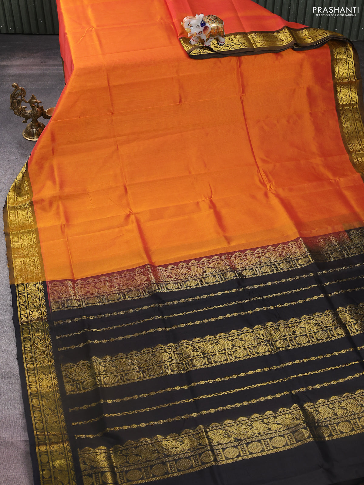 Silk cotton saree orange and black with plain body and zari woven border