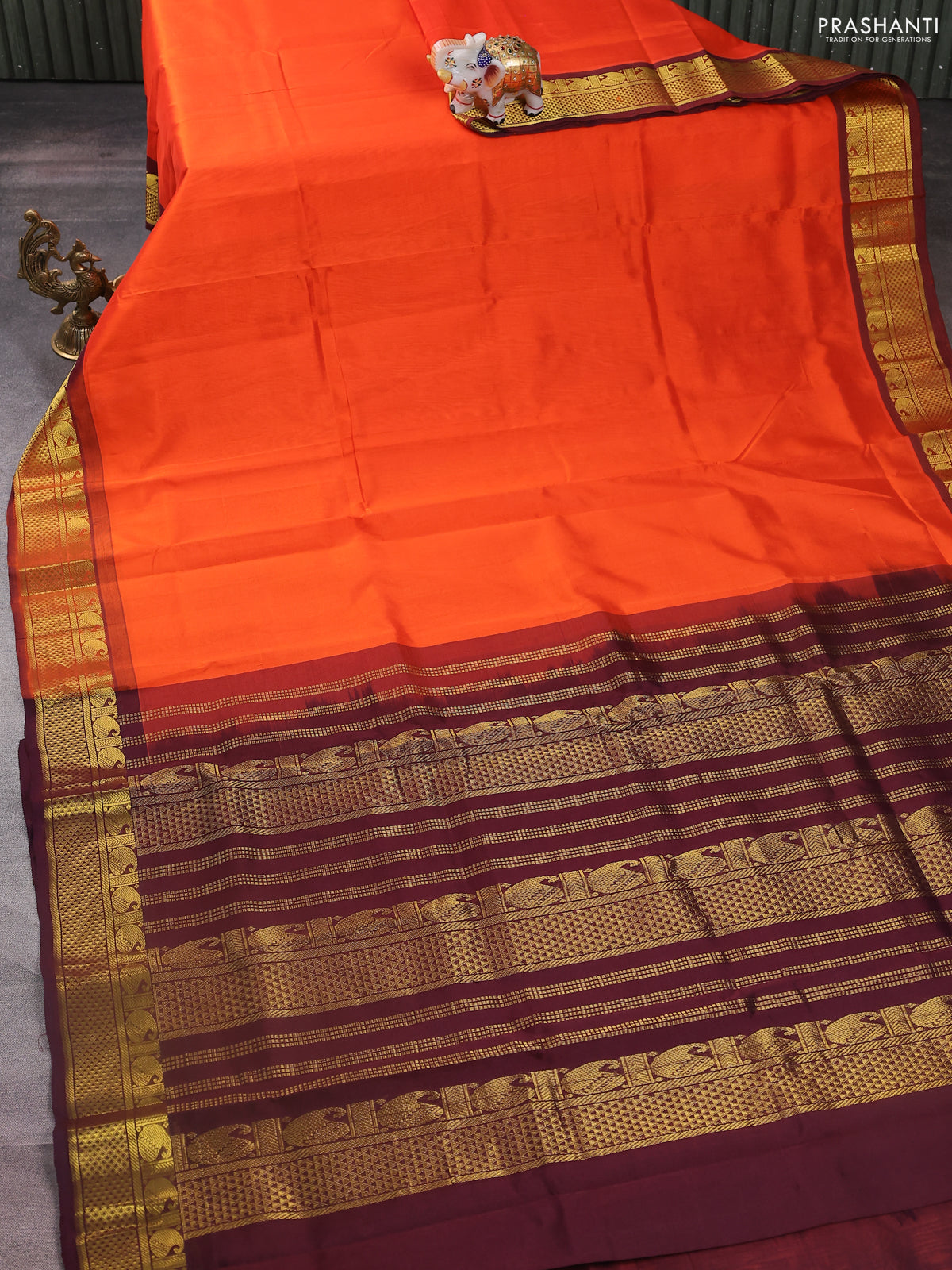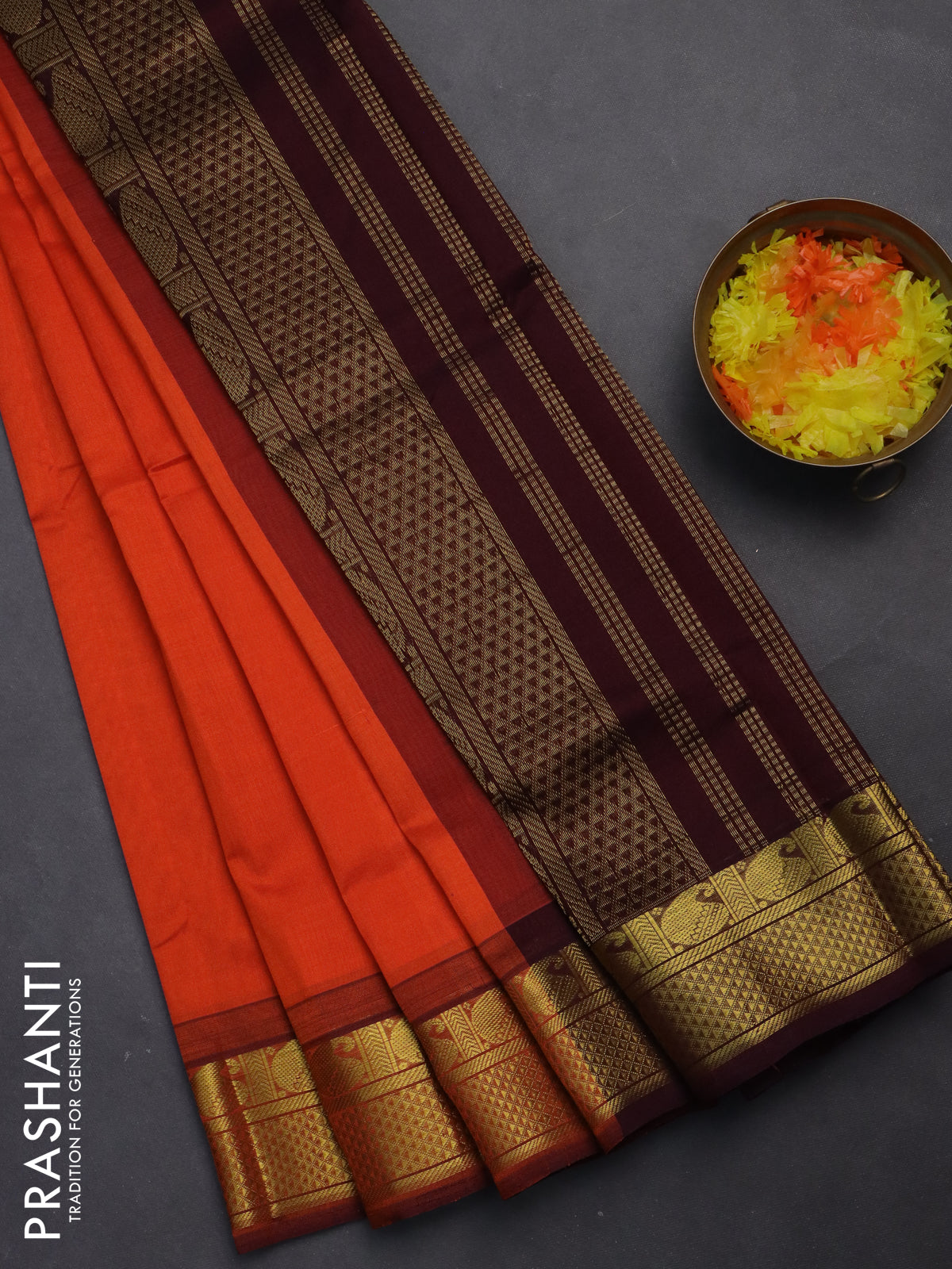 Silk cotton saree orange and deep maroon with plain body and zari woven border