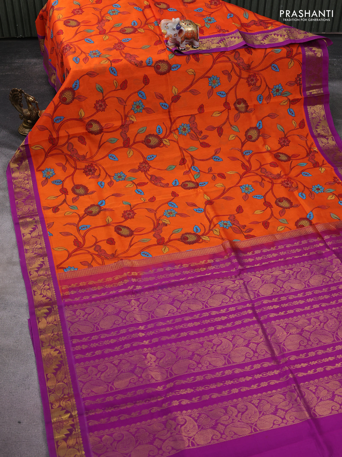 Silk cotton saree orange and purple with allover kalamkari prints and zari woven korvai border