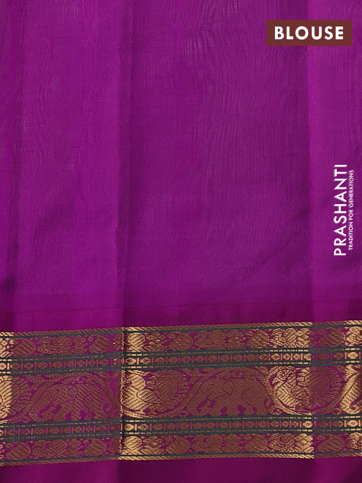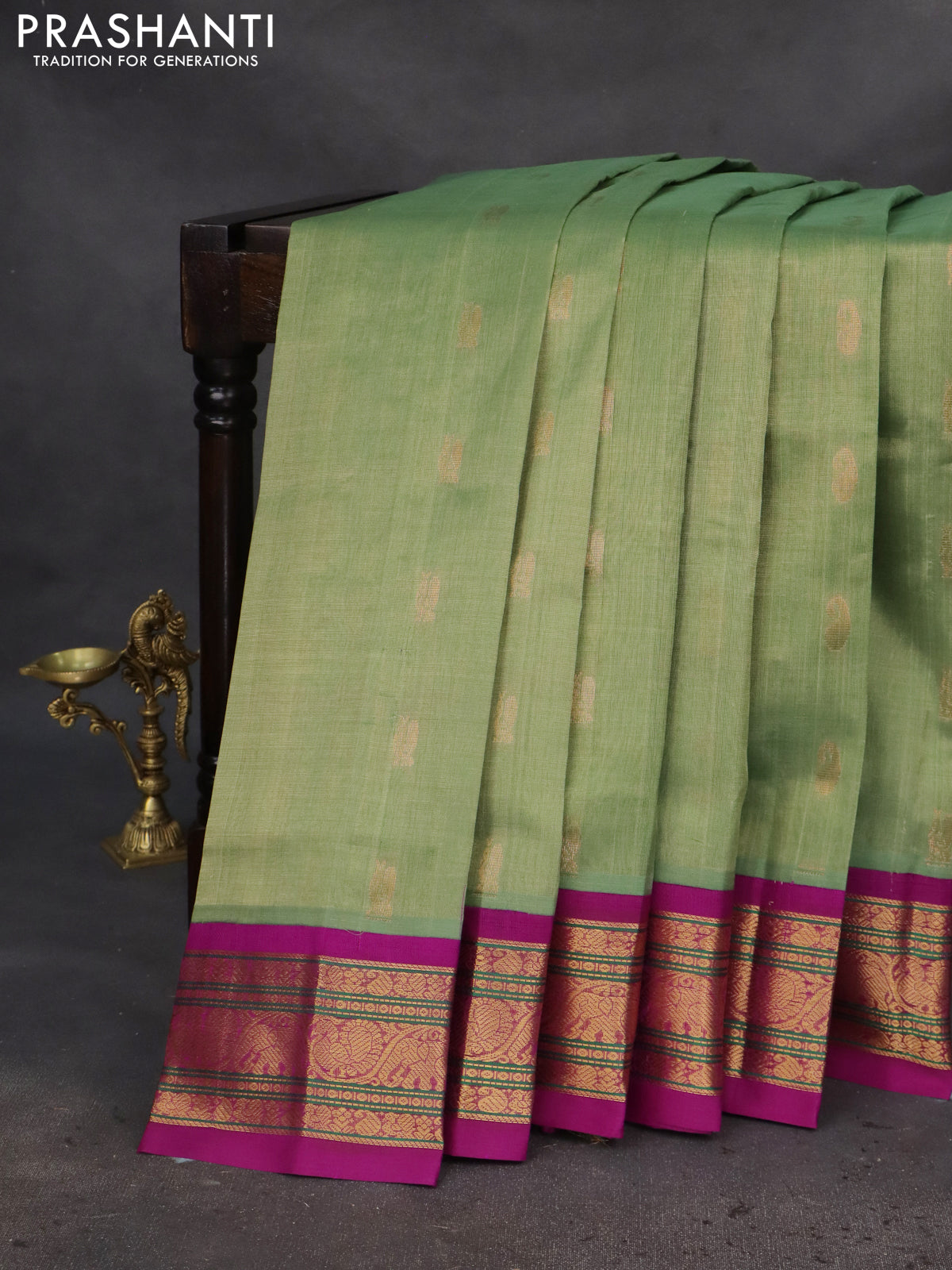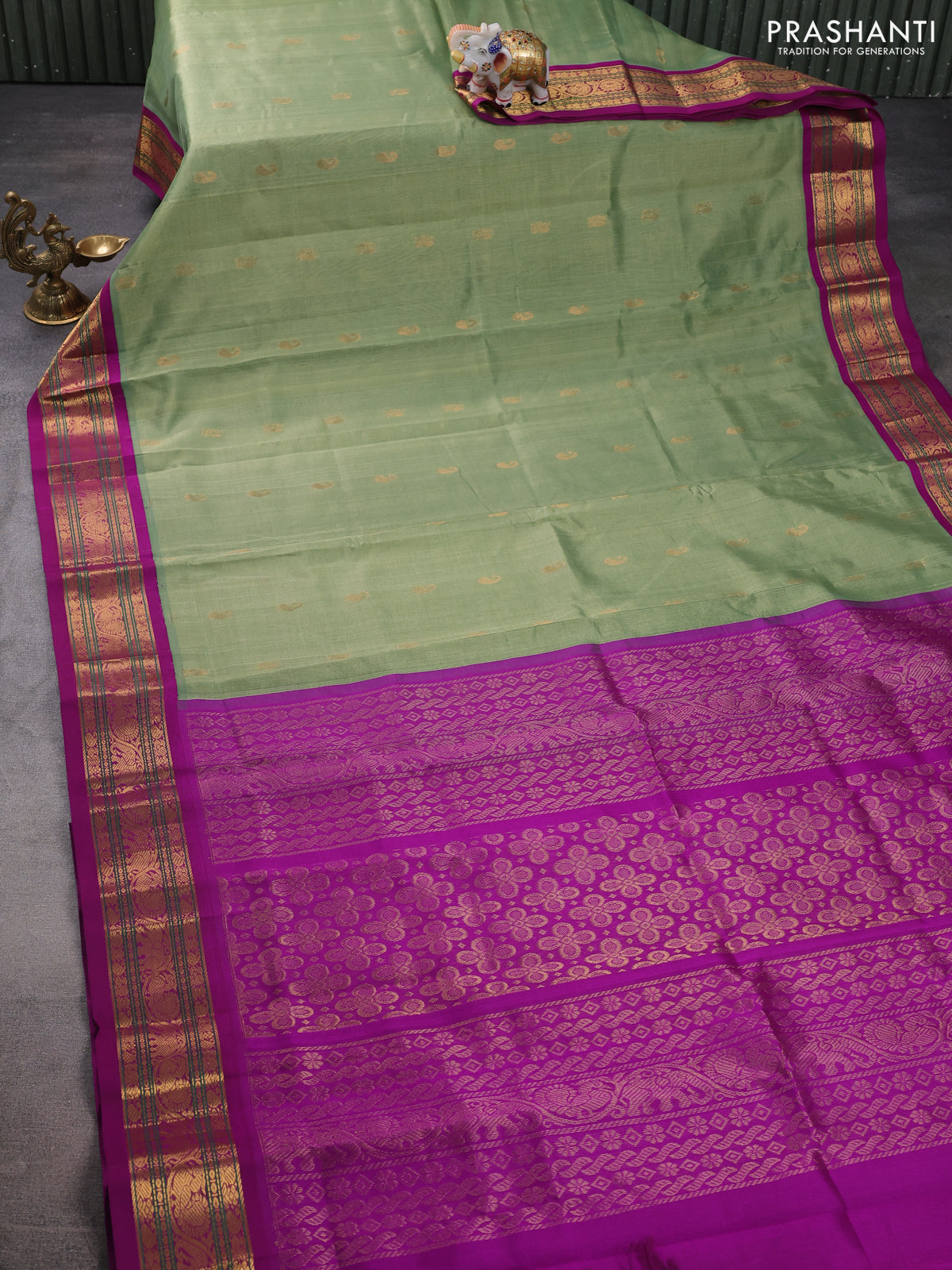 Silk cotton saree pastel green and purple with zari woven buttas and zari woven korvai border