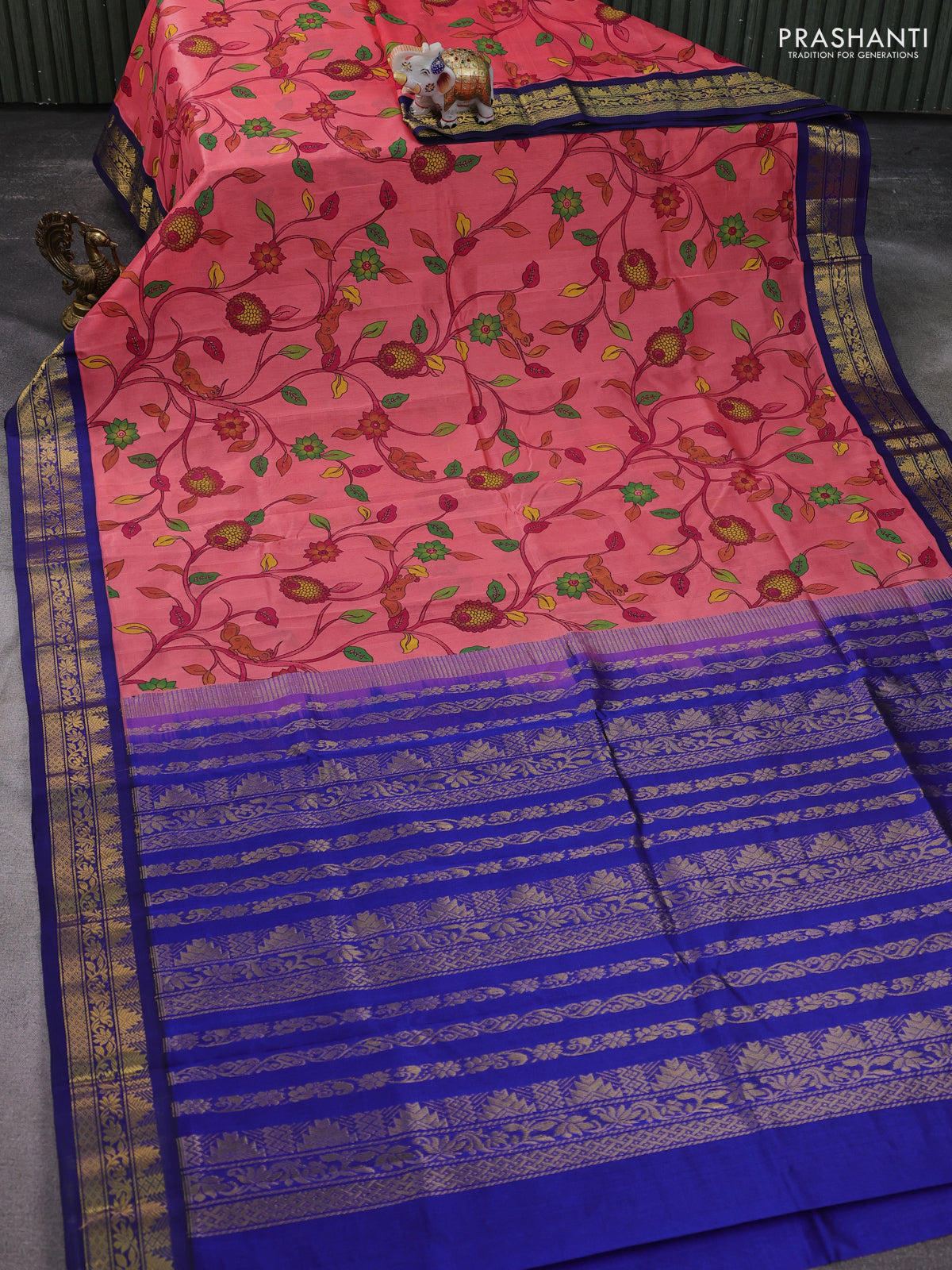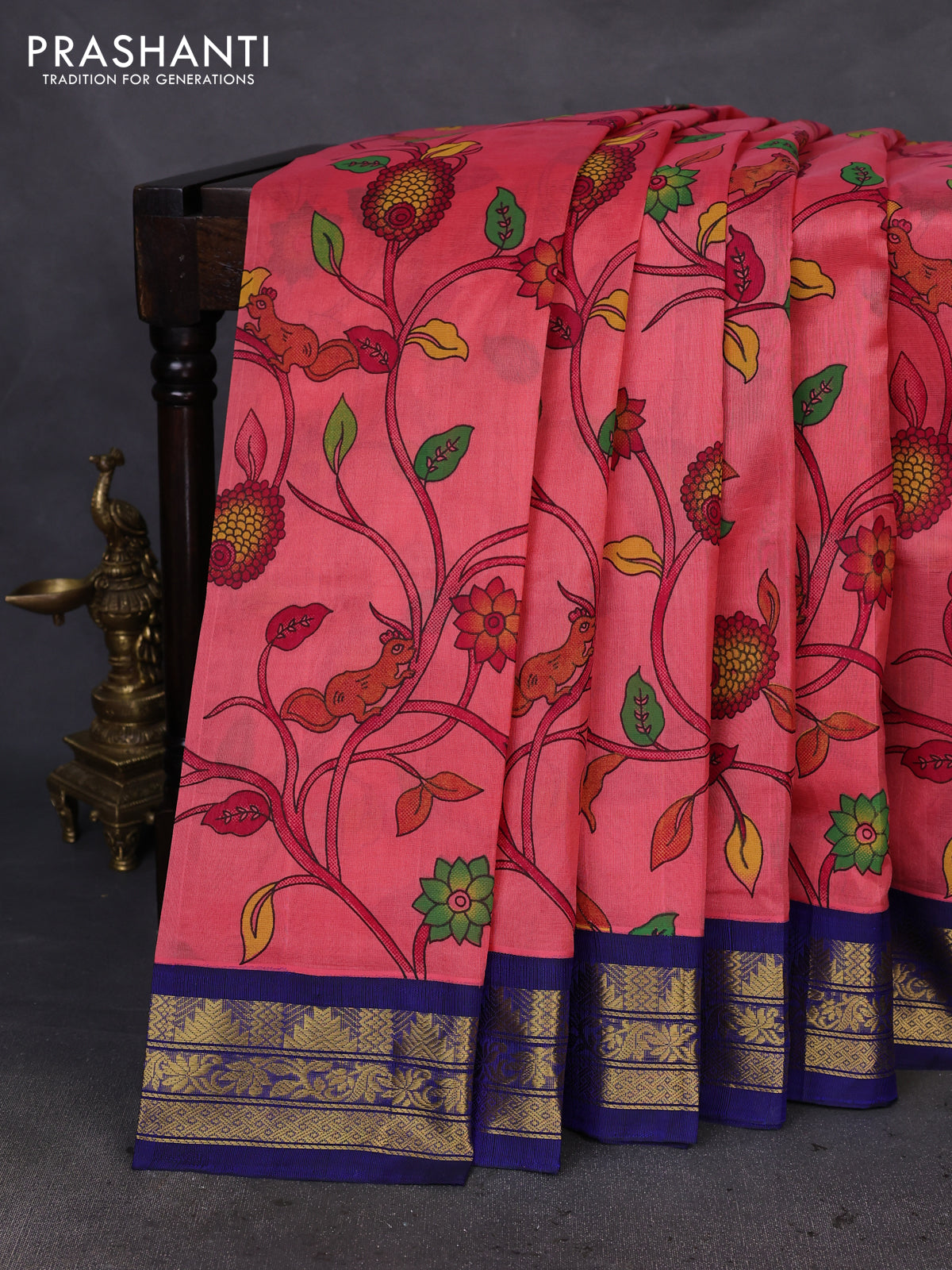 Silk cotton saree peach pink and navy blue with allover kalamkari prints and zari woven korvai border