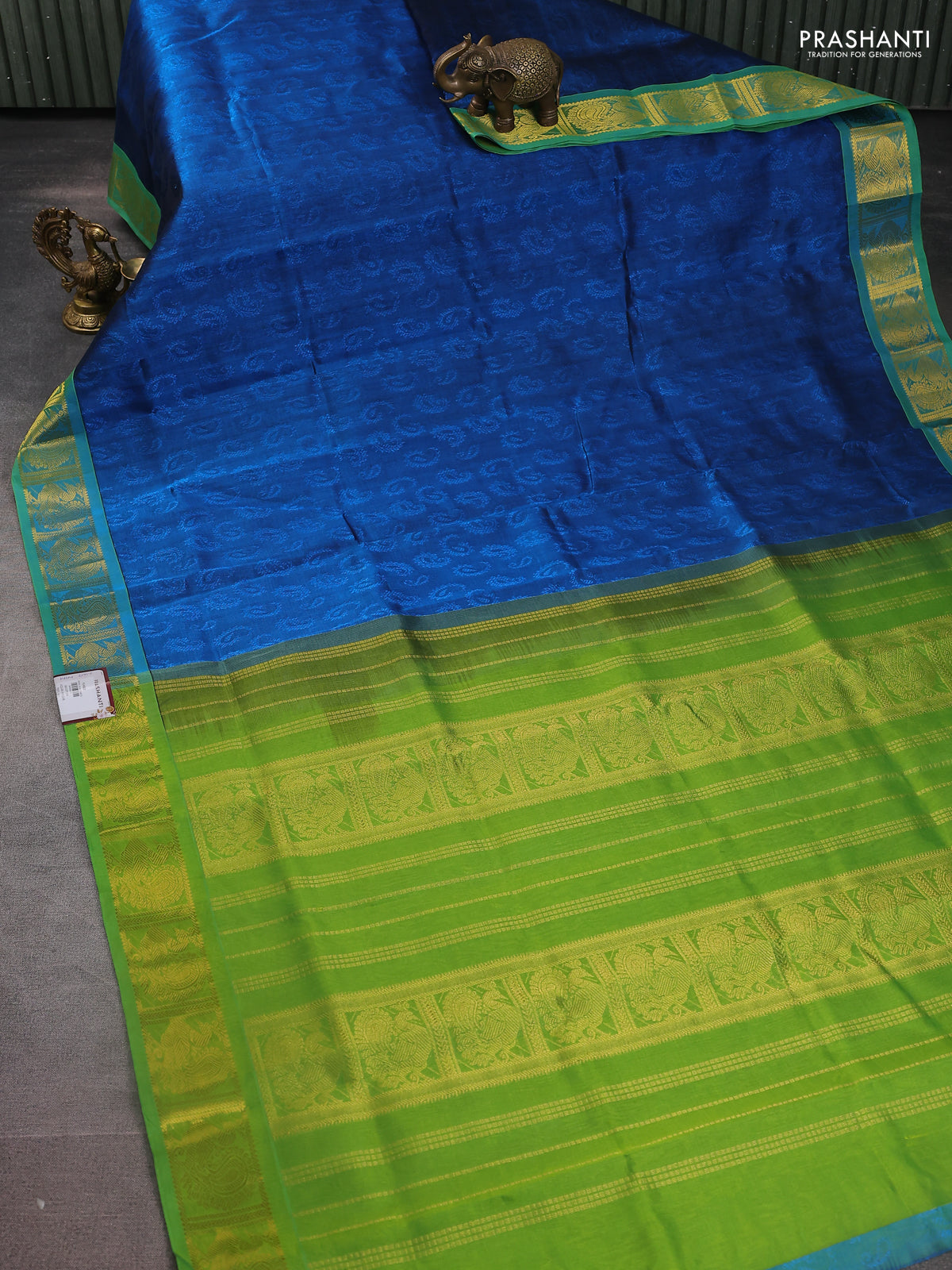 Silk cotton saree peacock blue and light green with allover self emboss jacquard and zari woven border