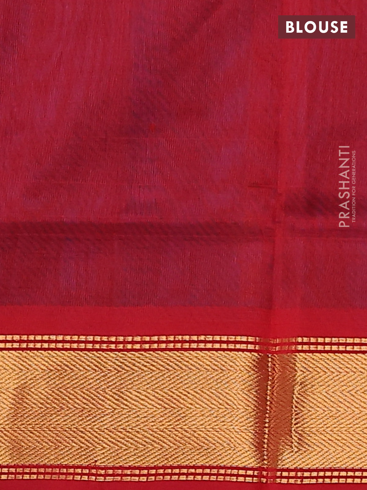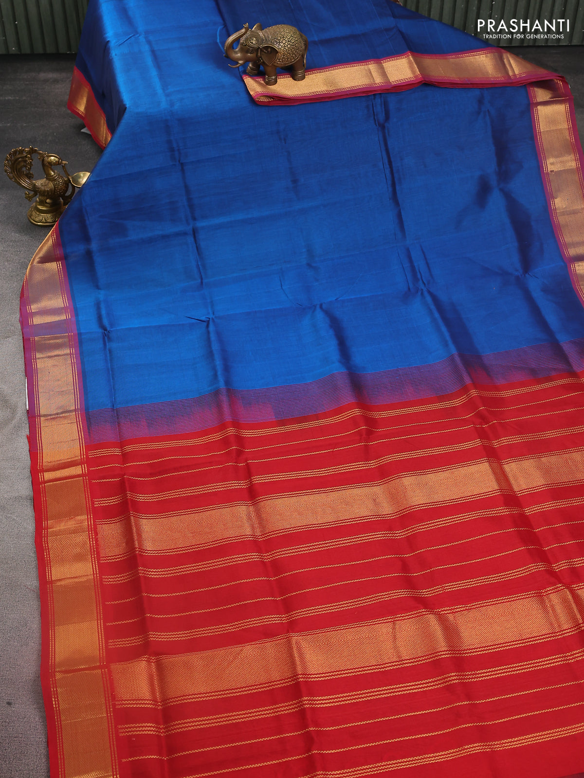 Silk cotton saree peacock blue and red with plain body and zari woven border