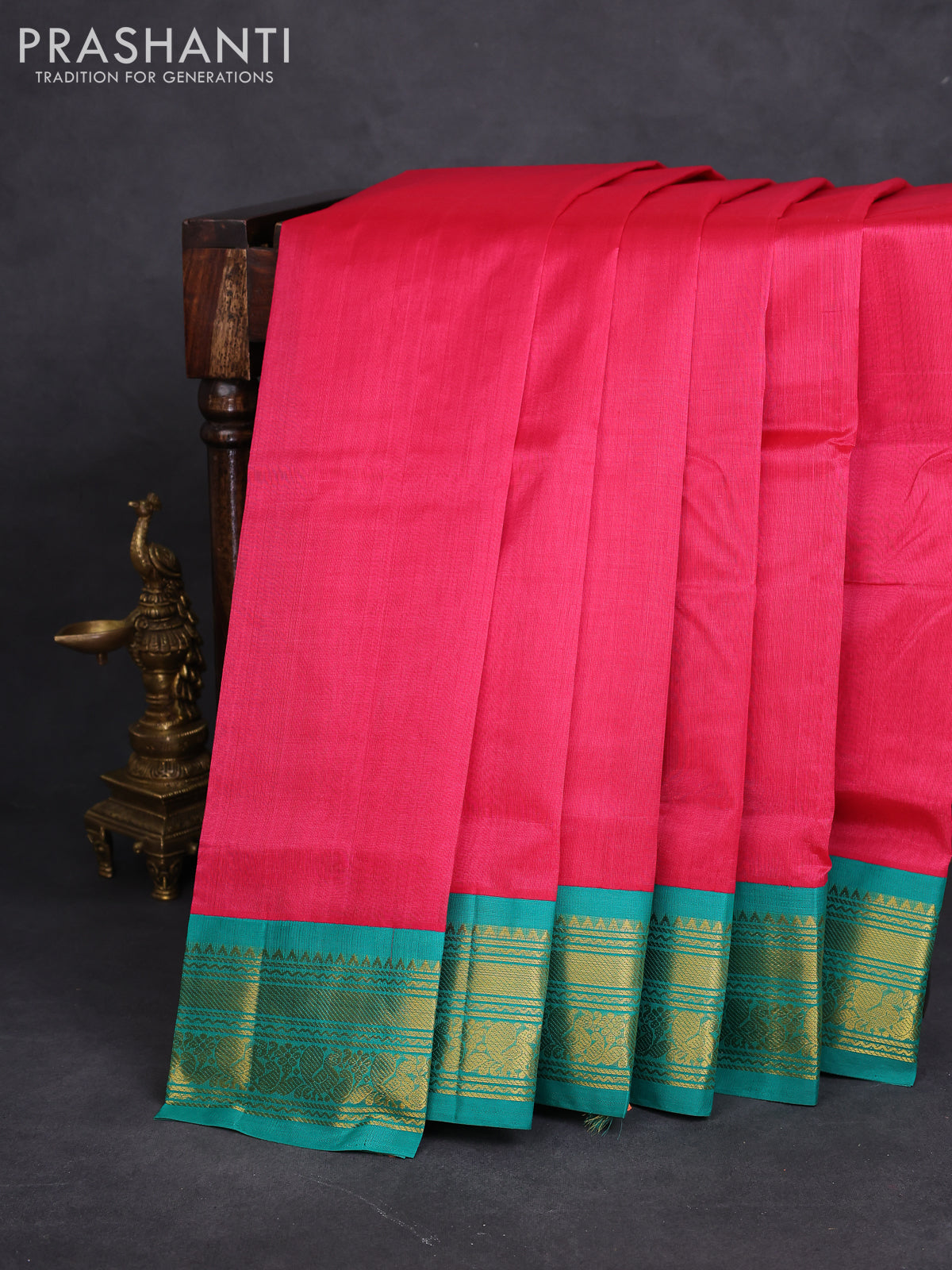 Silk cotton saree pink and teal green with plain body and zari woven korvai border