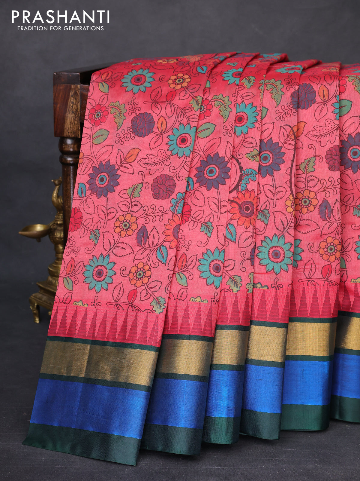 Silk cotton saree pink shade and bottle green with allover kalamkari prints and temple design zari woven simple border