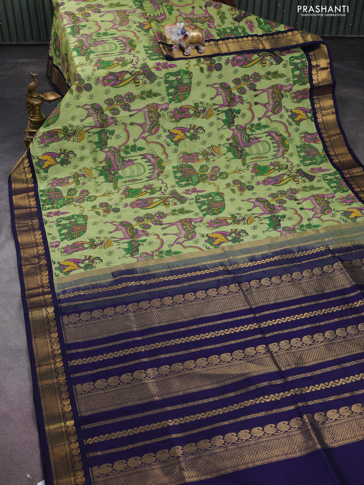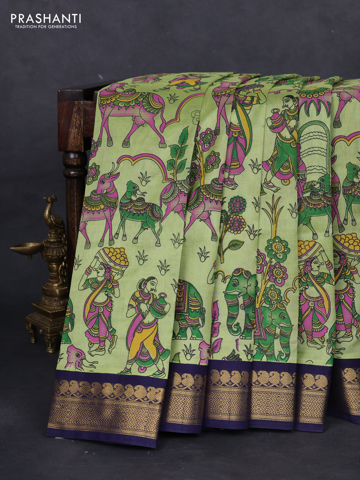 Silk cotton saree pista green and navy blue with allover kalamkari prints and zari woven korvai border