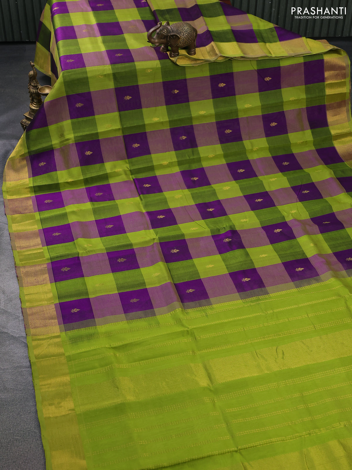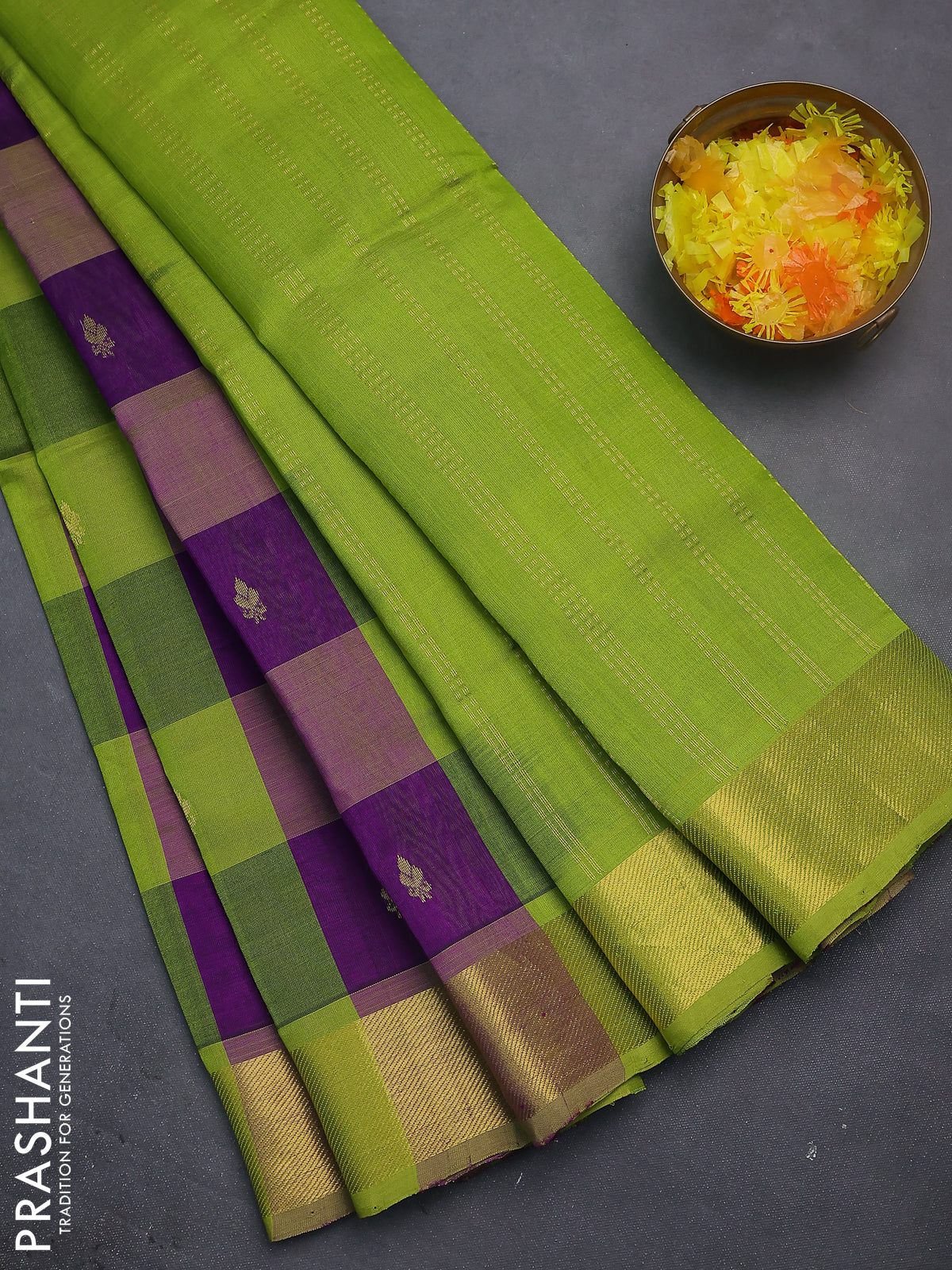 Silk cotton saree purple and light green with allover paalum pazhamun checks & zari buttas and zari woven border