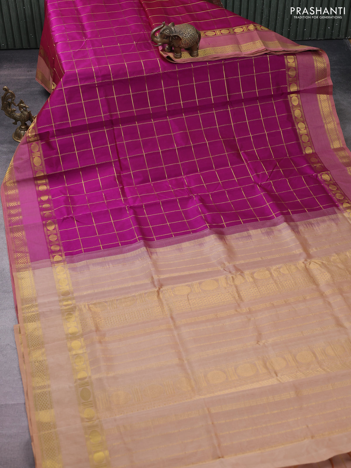 Silk cotton saree purple and sandal with allover zari checked pattern and rettapet zari woven border