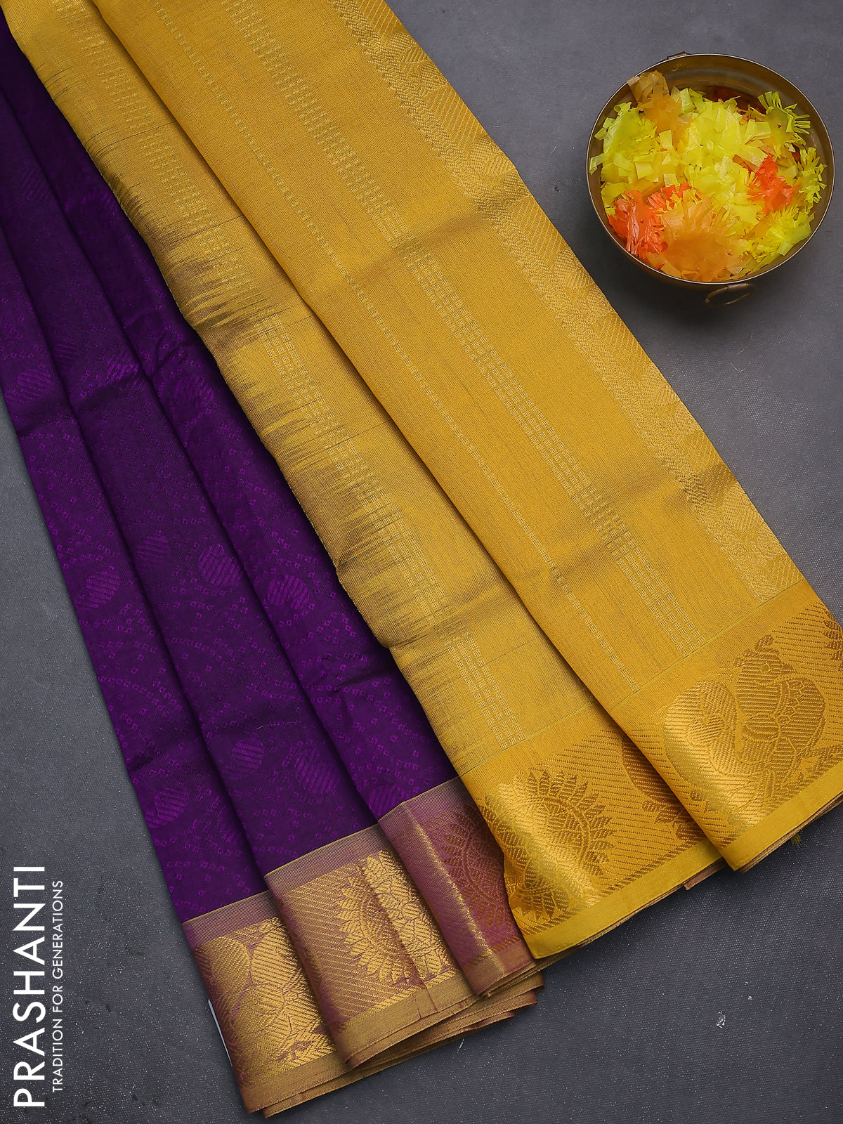 Silk cotton saree purple and yellow with allover self emboss jacquard and annam & rudhraksha zari woven border