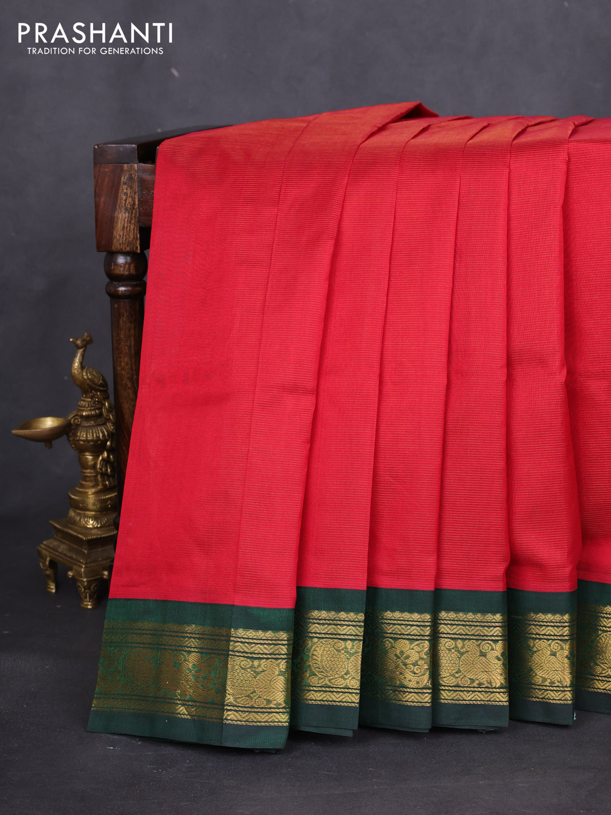 Silk cotton saree red and dark green with allover vairaosi pattern and zari woven korvai border
