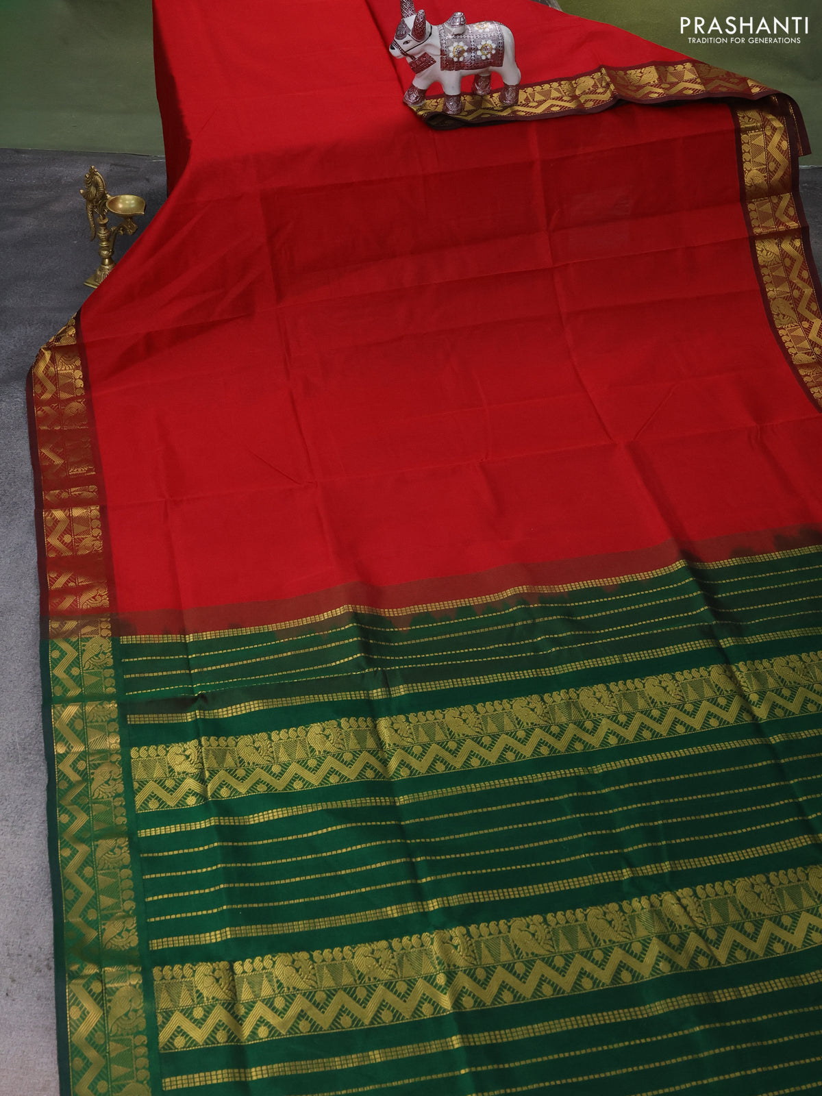 Silk Cotton saree red and green with plain body and zari woven border