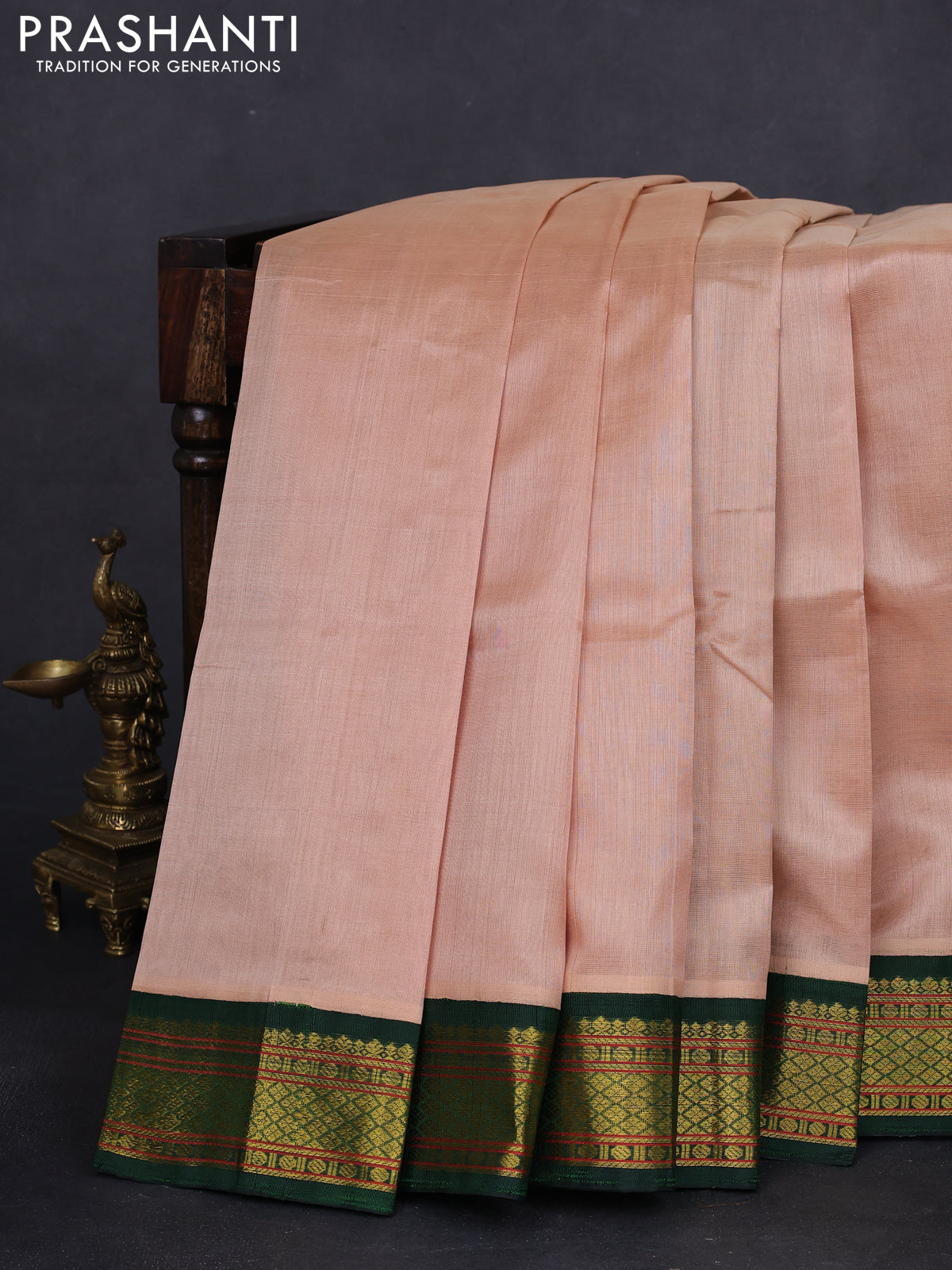 Silk cotton saree sandal and green with plain body and zari woven korvai border