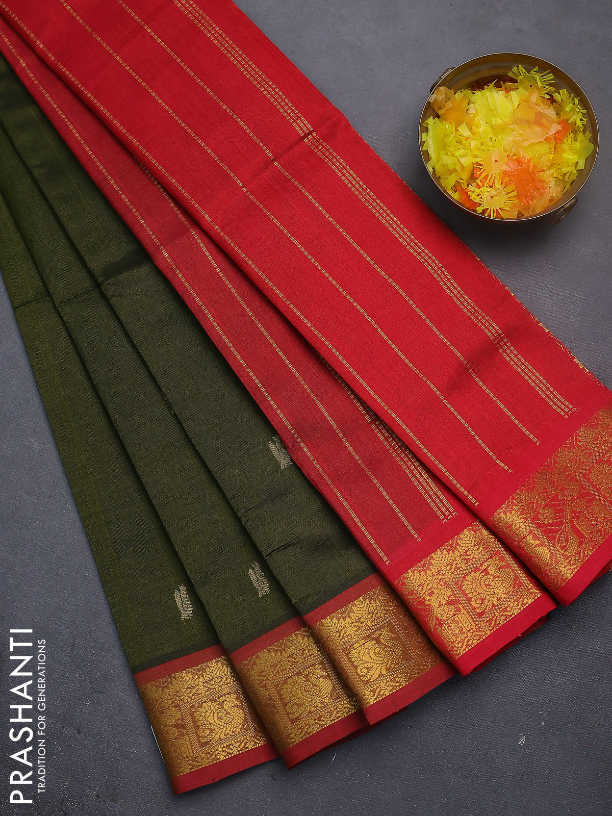 Silk cotton saree sap green and red with zari woven annam buttas and zari woven border