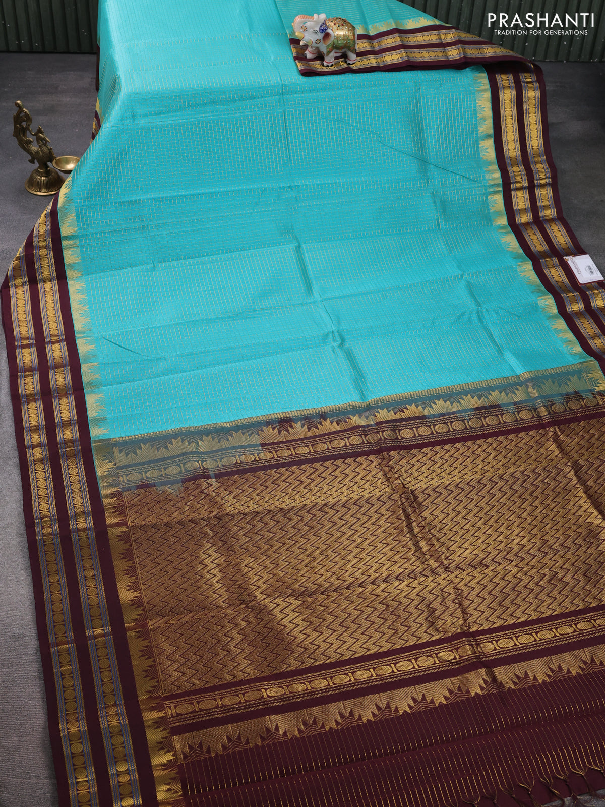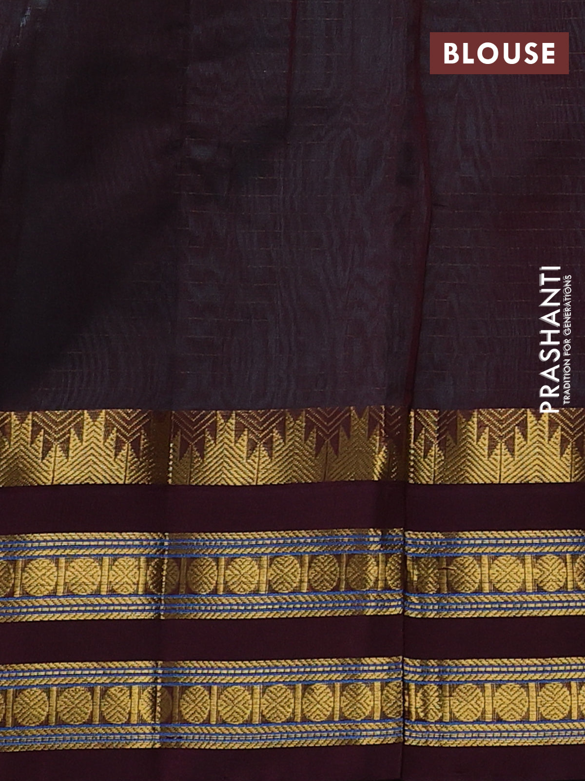 Silk cotton saree teal blue and deep maroon with allover small zari checked pattern and temple design zari woven korvai border