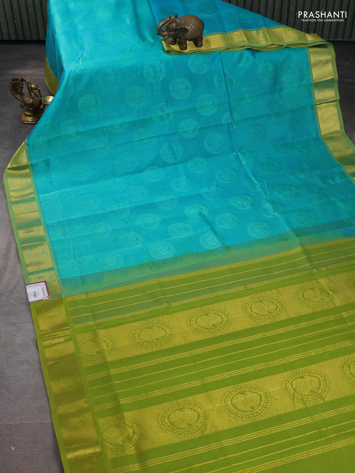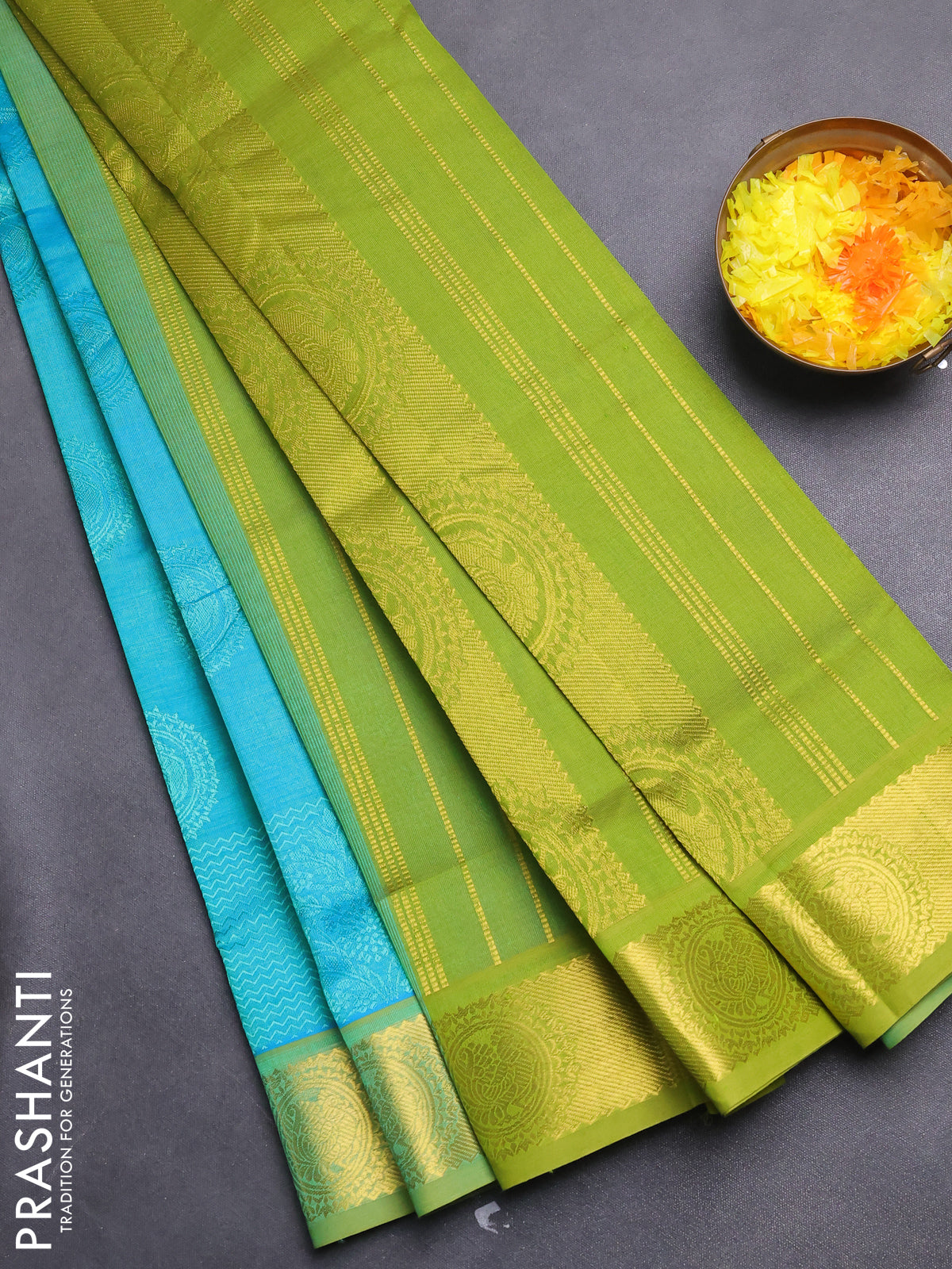 Silk cotton saree teal blue and light green with allover self emboss jacquard and zari woven border