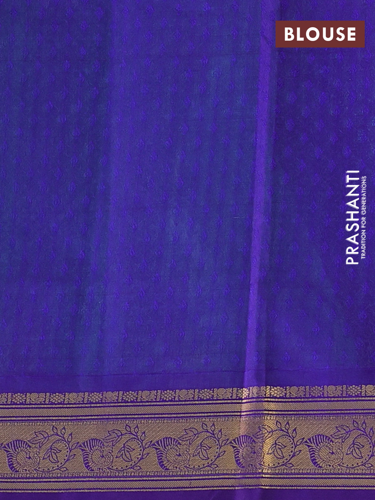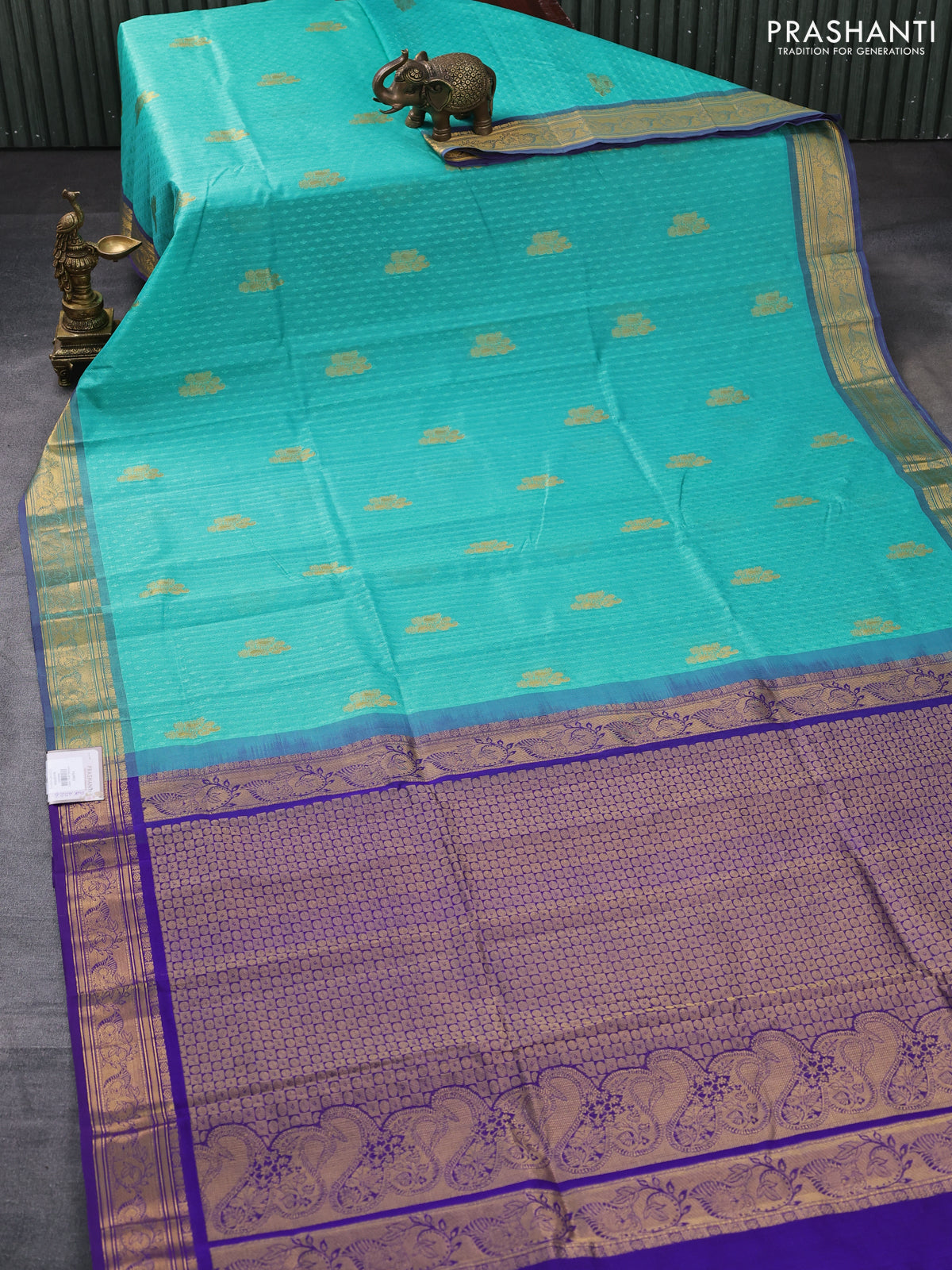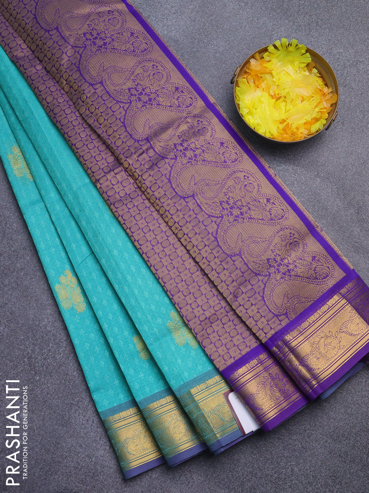 Silk cotton saree teal green and blue with allover self emboss jacquard & zari buttas and rich zari woven border