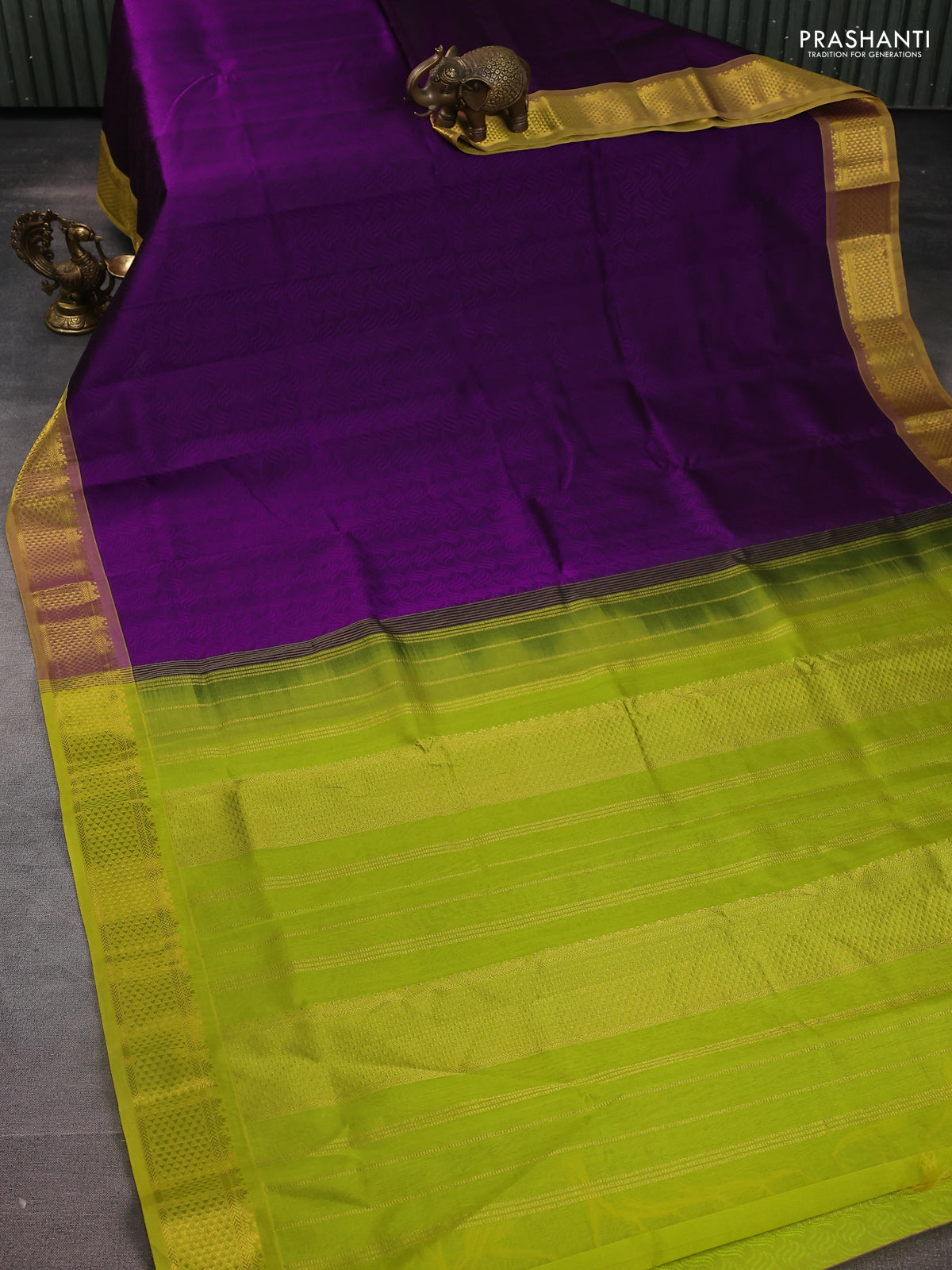 Silk cotton saree violet and lime green with allover self emboss jacquard and zari woven border