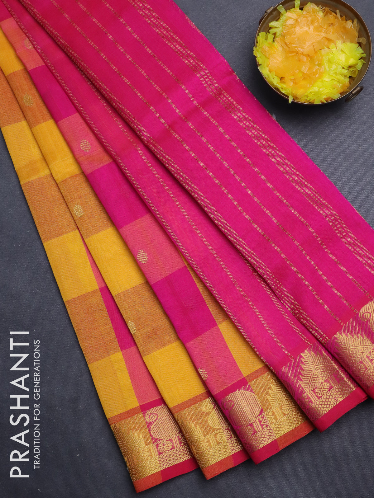Silk cotton saree yellow and pink with allover paalum pazhamum checks & zari buttas and paisley & temple zari woven border