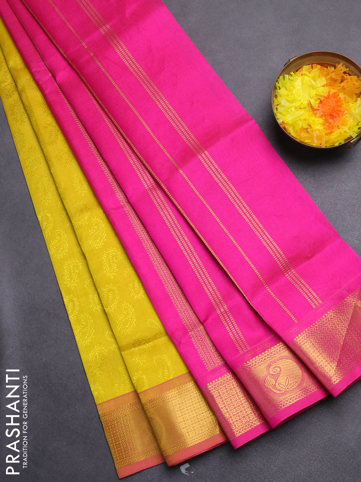 Silk cotton saree yellow and pink with allover self emboss jacquard and zari woven border