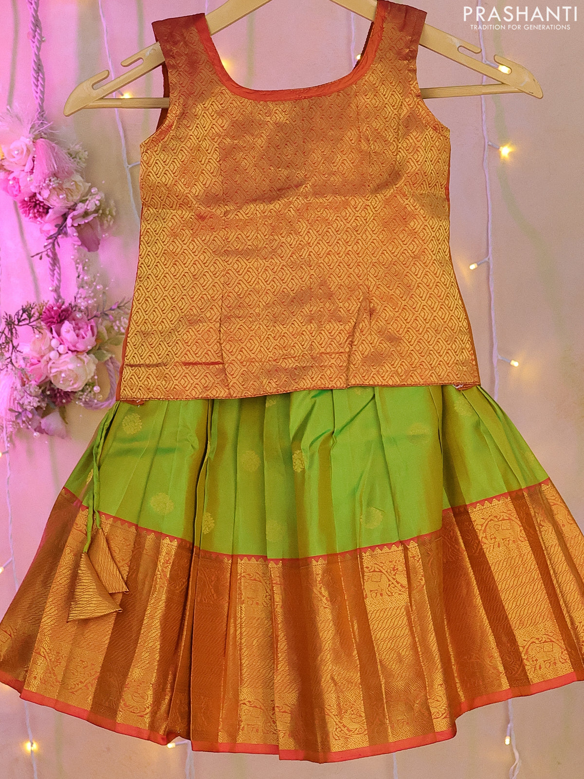 Silk kids lehenga dual shade of mustard and light green with zari woven brocade weaves and zari buttas & zari border for 1-2 years