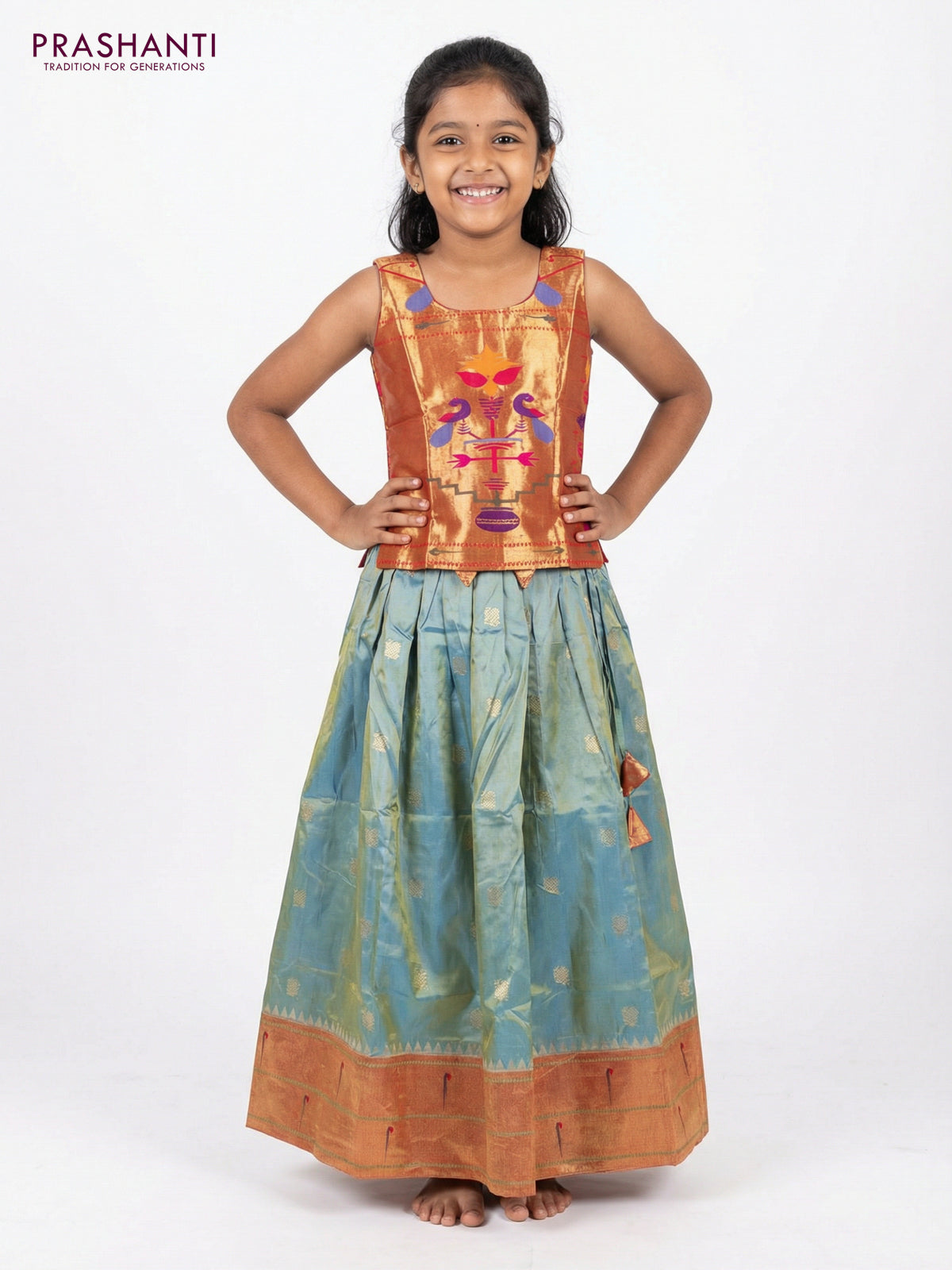Silk kids lehenga dual top dual shade of teal green and dual shade of blue with aari work neck pattern & coat type and zari woven buttas & paithani style border for 7-8 years
