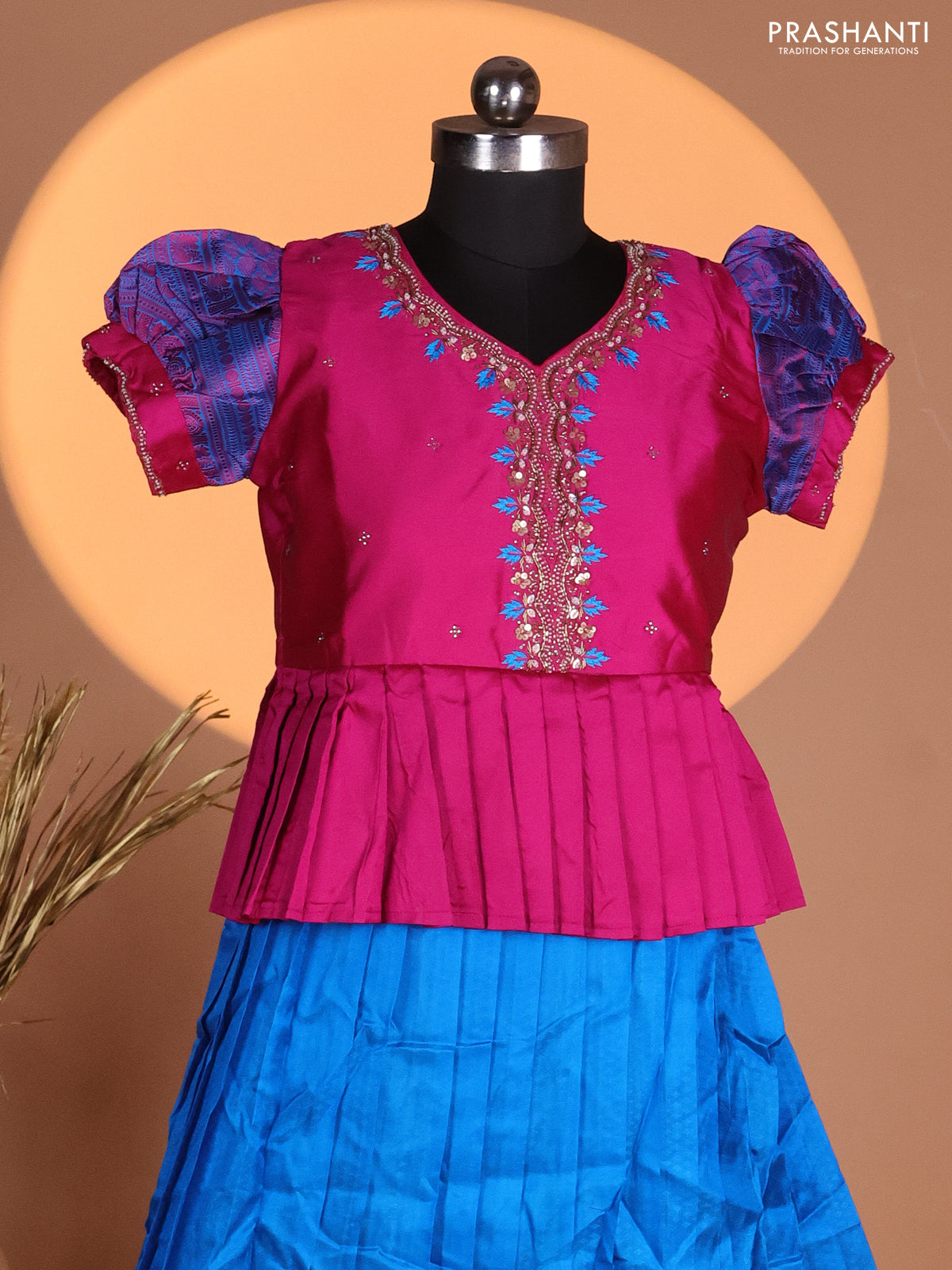 Silk kids lehenga magenta pink and cs blue with aari work neck pattern & puff sleeve and allover self emboss & zari woven border