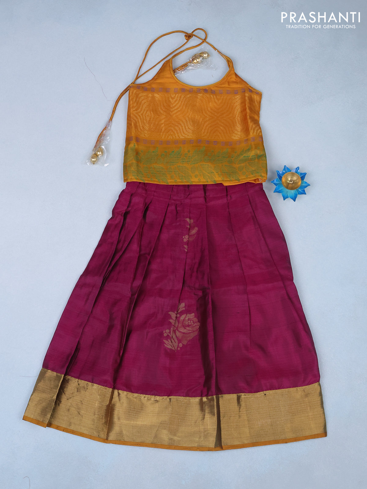 Silk kids lehenga mustard shade and dark magenta pink with zari weaves and back knot & zari woven border for 5 years